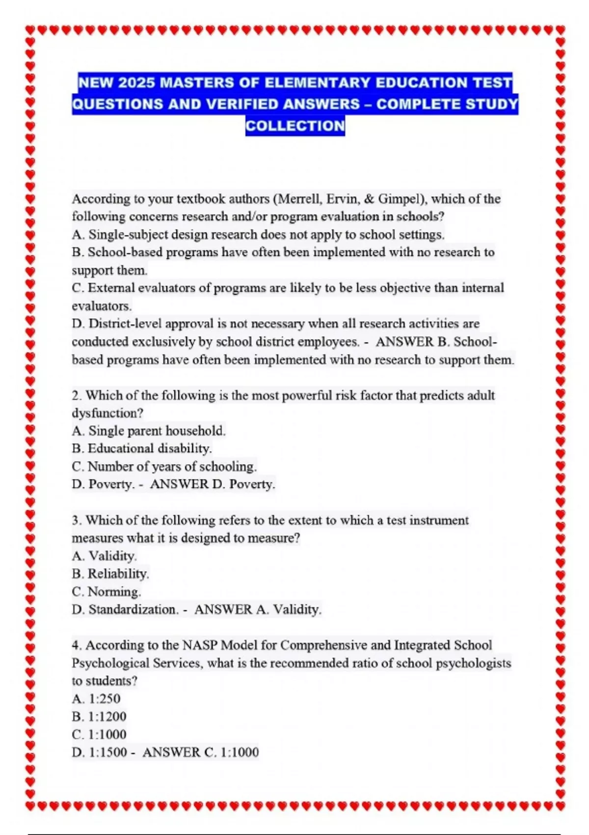 NEW 2025 MASTERS OF ELEMENTARY EDUCATION TEST QUESTIONS AND VERIFIED ANSWERS – COMPLETE STUDY COLLECTION...