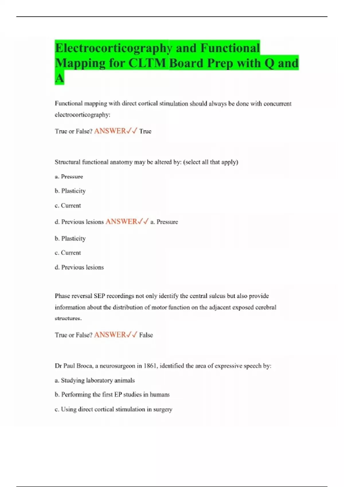 Electrocorticography and Functional Mapping for CLTM Board Prep with Q and A Functional mapping with direct cortical stimulation should always be done with concurrent electrocorticography: True or False? ANSWER True Structural functional anatomy may be altered by: (select all that apply) a. Pressure b. Plasticity c. Current d. Previous lesions ANSWER a. Pressure b. Plasticity c. Current d. Previous lesions Phase reversal SEP recordings not only identify the central sulcus but also provide information about the distribution of motor function on the adjacent exposed cerebral structures. True or False? ANSWER False Dr Paul Broca, a neurosurgeon in 1861, identified the area of expressive speech by: a. Studying laboratory animals b. Performing the first EP studies in humans c. Using direct cortical stimulation in surgery
