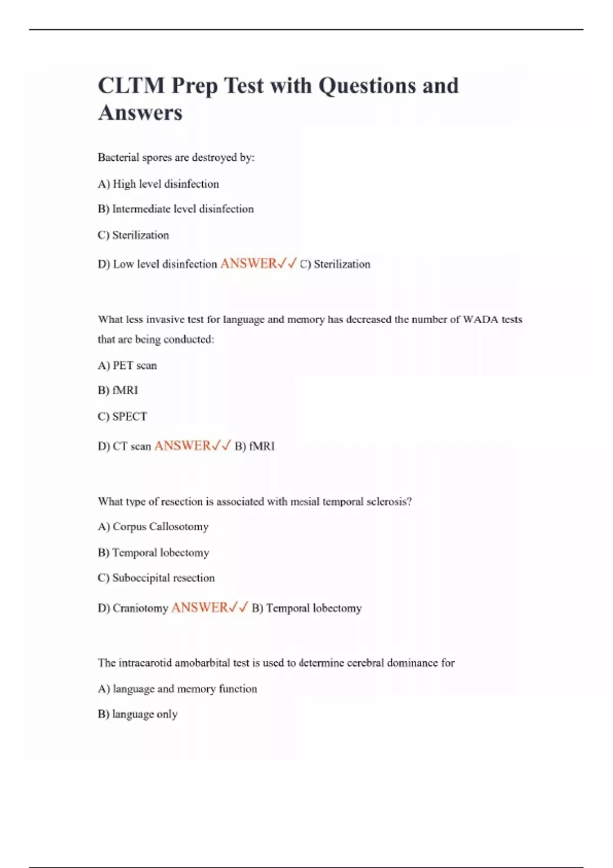 CLTM Prep Test with Questions and Answers Bacterial spores are destroyed by: A) High level disinfection B) Intermediate level disinfection C) Sterilization D) Low level disinfection ANSWER C) Sterilization What less invasive test for language and memory has decreased the number of WADA tests that are being conducted: A) PET scan B) fMRI C) SPECT D) CT scan ANSWER B) fMRI What type of resection is associated with mesial temporal sclerosis? A) Corpus Callosotomy B) Temporal lobectomy C) Suboccipital resection D) Craniotomy ANSWER B) Temporal lobectomy The intracarotid amobarbital test is used to determine cerebral dominance for A) language and memory function B) language only