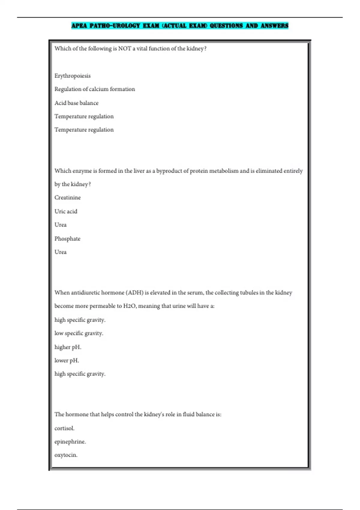 , APEA PATHO-UROLOGY EXAM (ACTUAL EXAM) QUESTIONS AND ANSWERS