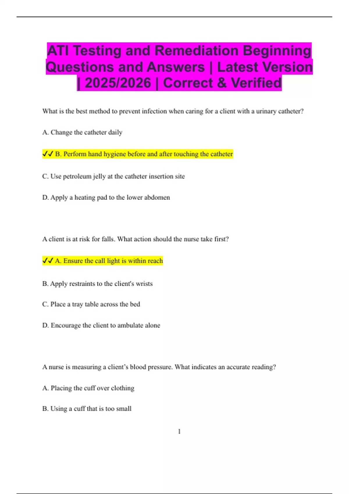ATI Testing and Remediation Beginning Questions and Answers | Latest Version | 2025/2026 | Correct & Verified What is the best method to prevent infection when caring for a client with a urinary catheter? A. Change the catheter daily B. Perform hand hygiene before and after touching the catheter C. Use petroleum jelly at the catheter insertion site D. Apply a heating pad to the lower abdomen A client is at risk for falls. What action should the nurse take first? A. Ensure the call light is within reach B. Apply restraints to the client's wrists C. Place a tray table across the bed D. Encourage the client to ambulate alone A nurse is measuring a client’s blood pressure. What indicates an accurate reading? A. Placing the cuff over clothing B. Using a cuff that is too small 2 C. Supporting the client’s arm at heart level D. Deflating the cuff immediately after inflation What is the purpose of a gait belt? A. To immobilize a client’s spine B. To assist with safe ambulation C. To prevent foot drop D. To keep linens in place Which finding should the nurse report immediately after surgery? A. Respiratory rate of 8 breaths per minute B. Pain level of 6 out of 10 C. Warm, dry skin D. Oxygen saturation of 95% What is the best way to identify a client before giving medication? A. Ask the client to state their full name and date of birth B. Look at the room number 3 C. Ask the roommate for the client’s name D. Check the medication label A nurse is caring for a client with a pressure injury. What is an appropriate intervention? A. Keep the client in one position B. Reposition the client every 2 hours C. Massage over bony areas D. Use plastic sheets for bedding Which statement by the client indicates understanding of using an incentive spirometer? A. “I will blow into the device forcefully.” B. “I will breathe in slowly and deeply.” C. “I will use it once a day.” D. “I only need to use it if I’m coughing.” What should a nurse do before applying a wrist restraint? A. Apply it loosely for comfort B. Double-knot the ties 4 C. Get a provider’s prescription D. Ask another nurse to apply it A nurse is teaching a client how to use a walker. Which instruction is correct? A. Move the walker first, then step with the weaker leg B. Step backward before moving the walker C. Keep both feet behind the walker when walking D. Drag the walker along the floor