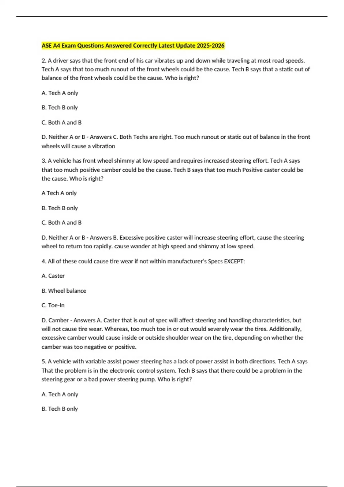 ASE A4 Exam Questions Answered Correctly Latest Update 2. A driver says that the front end of his car vibrates up and down while traveling at most road speeds. Tech A says that too much runout of the front wheels could be the cause. Tech B says that a static out of balance of the front wheels could be the cause. Who is right? A. Tech A only B. Tech B only C. Both A and B D. Neither A or B - Answers C. Both Techs are right. Too much runout or static out of balance in the front wheels will cause a vibration 3. A vehicle has front wheel shimmy at low speed and requires increased steering effort. Tech A says that too much positive camber could be the cause. Tech B says that too much Positive caster could be the cause. Who is right? A Tech A only B. Tech B only C. Both A and B D. Neither A or B - Answers B. Excessive positive caster will increase steering effort, cause the steering wheel to return too rapidly. cause wander at high speed and shimmy at low speed. 4. All of these could cause tire wear if not within manufacturer's Specs EXCEPT: A. Caster B. Wheel balance C. Toe-In D. Camber - Answers A. Caster that is out of spec will affect steering and handling characteristics, but will not cause tire wear. Whereas, too much toe in or out would severely wear the tires. Additionally, excessive camber would cause inside or outside shoulder wear on the tire, depending on whether the camber was too negative or positive. 5. A vehicle with variable assist power steering has a lack of power assist in both directions. Tech A says That the problem is in the electronic control system. Tech B says that there could be a problem in the steering gear or a bad power steering pump. Who is right? A. Tech A only B. Tech B only C. Both A and B D. Neither A or B - Answers B. Although further diagnosis will be necessary, Tech B is right. Tech A is wrong because, when there is a malfunction in a variable assist power steering system, the system will allow full power steering. 6. A customer complains that a vehicle wanders on a bumpy road and needs continual driver correction to stay straight. What could be Wrong? A. Excessive negative front caster B. Insufficient front toe C. Rear or front bump steer D. All of the above - Answers D. Excessive negative caster, insufficient front toe, and front or rear bump steer could cause a vehicle to wander on a bumpy road. 7. While aligning a front end, a technician finds the toe out on turns (turning Radius) to be greater than the manufacturer's Specs and it has 2.0 degrees difference from the left side to the right side. Which, if any, of the following could be the cause? A. Nothing is wrong; the vehicle has a non symmetrical steering design. B. Bent pitman arm C. bent tie-rod D. Both B and C - Answers D. either a bent pitman arm or a tie rod could cause the specifications for the toe out on turns to be out of spec. Vehilces with non symmetrical steering systems will have a difference from side to side, but the difference will not exceed the manufacturer's specs and it rarely has a greater than 1.5 degrees difference from side to side. 8. When checking a tire, a tech find it to have too much radial (up and down) runout. Tech A says to rotate the tire and wheel assembly on the mounting studs to correct the problem. Tech B says to rotate the tire on the wheel assembly to attempt to bring the runout within specs. Who is right? A. Tech A Only B. Tech B Only C. Both A and B C. Neither - Answers B. Rotating the tire on the wheel will compensate for wheel/tire