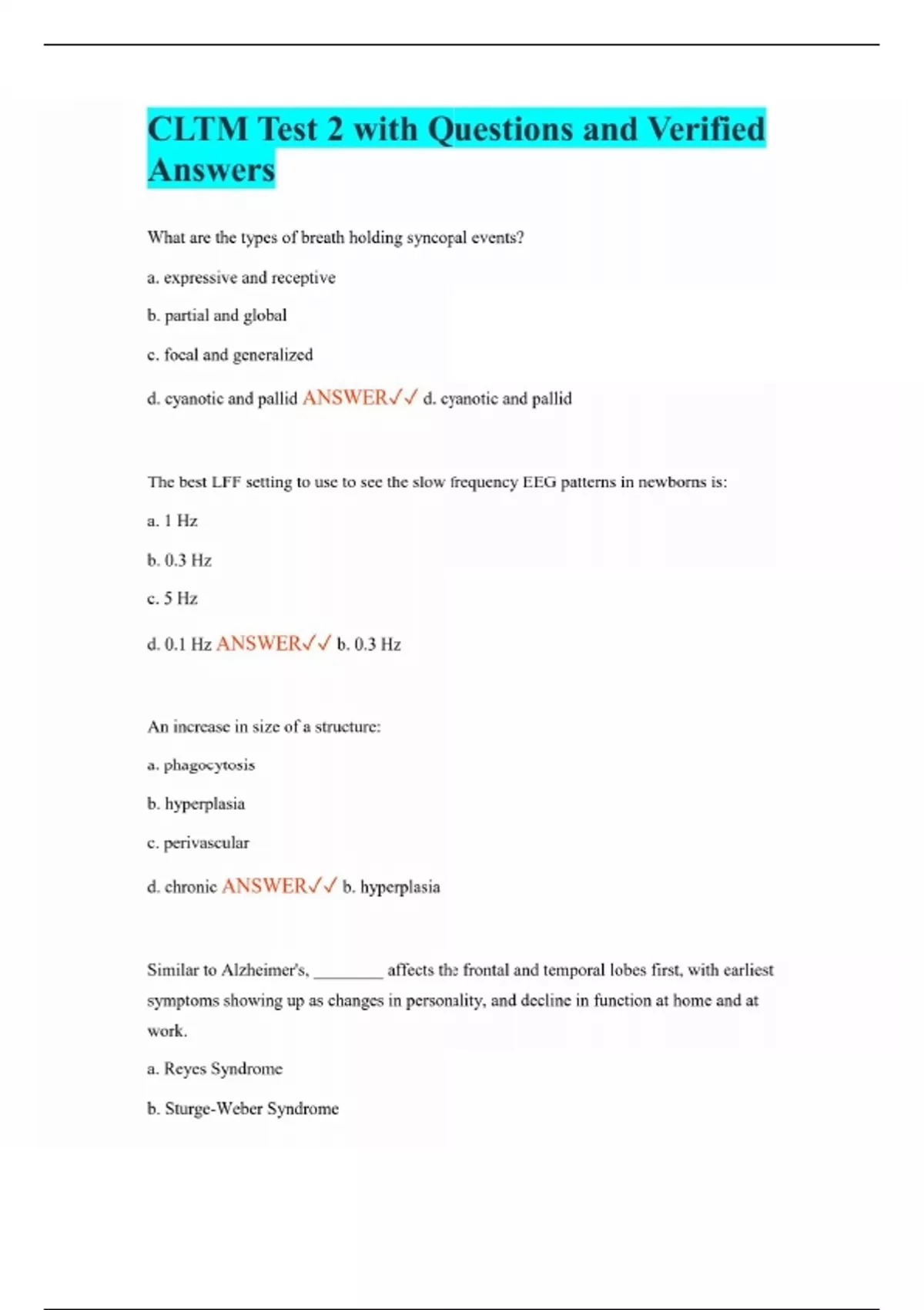 CLTM Test 2 with Questions and Verified Answers What are the types of breath holding syncopal events? a. expressive and receptive b. partial and global c. focal and generalized d. cyanotic and pallid ANSWER d. cyanotic and pallid The best LFF setting to use to see the slow frequency EEG patterns in newborns is: a. 1 Hz b. 0.3 Hz c. 5 Hz d. 0.1 Hz ANSWER b. 0.3 Hz An increase in size of a structure: a. phagocytosis b. hyperplasia c. perivascular d. chronic ANSWER b. hyperplasia Similar to Alzheimer's, ________ affects the frontal and temporal lobes first, with earliest symptoms showing up as changes in personality, and decline in function at home and at work. a. Reyes Syndrome b. Sturge-Weber Syndrome