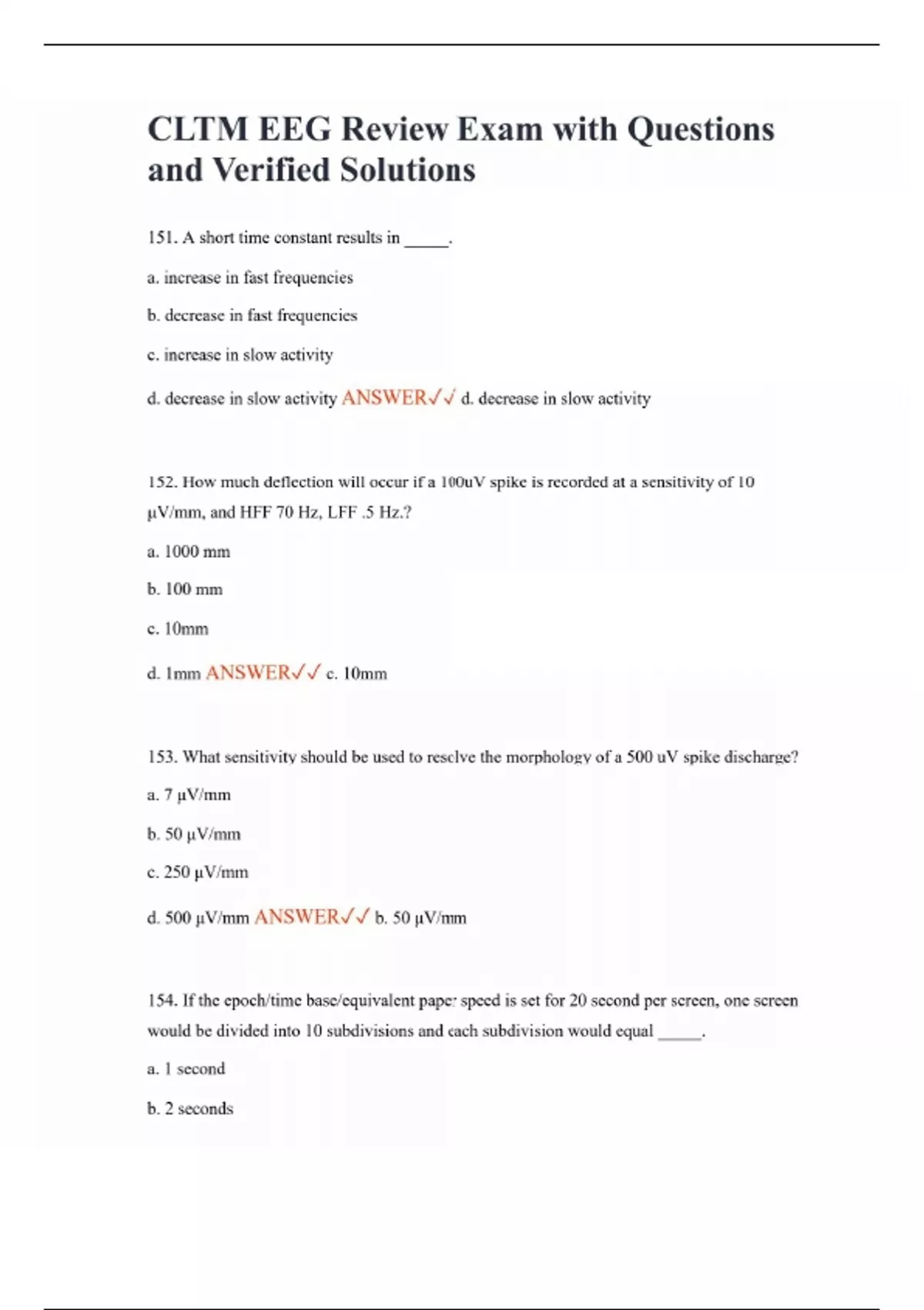 CLTM EEG Review Exam with Questions and Verified Solutions 151. A short time constant results in _____. a. increase in fast frequencies b. decrease in fast frequencies c. increase in slow activity d. decrease in slow activity ANSWER d. decrease in slow activity 152. How much deflection will occur if a 100uV spike is recorded at a sensitivity of 10 μV/mm, and HFF 70 Hz, LFF .5 Hz.? a. 1000 mm b. 100 mm c. 10mm d. 1mm ANSWER c. 10mm 153. What sensitivity should be used to resolve the morphology of a 500 uV spike discharge? a. 7 μV/mm b. 50 μV/mm c. 250 μV/mm d. 500 μV/mm ANSWER b. 50 μV/mm 154. If the epoch/time base/equivalent paper speed is set for 20 second per screen, one screen would be divided into 10 subdivisions and each subdivision would equal _____. a. 1 second b. 2 seconds