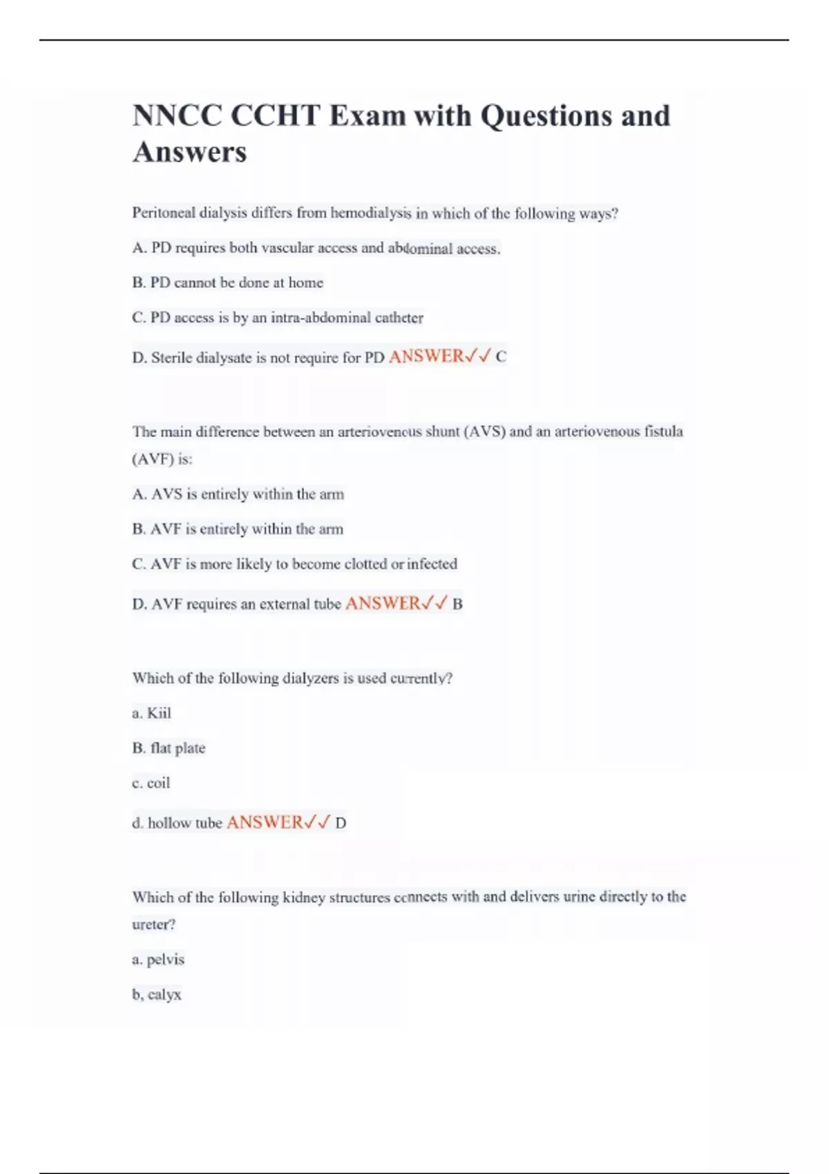 NNCC CCHT Exam with Questions and Answers Peritoneal dialysis differs from hemodialysis in which of the following ways? A. PD requires both vascular access and abdominal access. B. PD cannot be done at home C. PD access is by an intra-abdominal catheter D. Sterile dialysate is not require for PD ANSWER C The main difference between an arteriovenous shunt (AVS) and an arteriovenous fistula (AVF) is: A. AVS is entirely within the arm B. AVF is entirely within the arm C. AVF is more likely to become clotted or infected D. AVF requires an external tube ANSWER B Which of the following dialyzers is used currently? a. Kiil B. flat plate c. coil d. hollow tube ANSWER D Which of the following kidney structures connects with and delivers urine directly to the ureter? a. pelvis b, calyx
