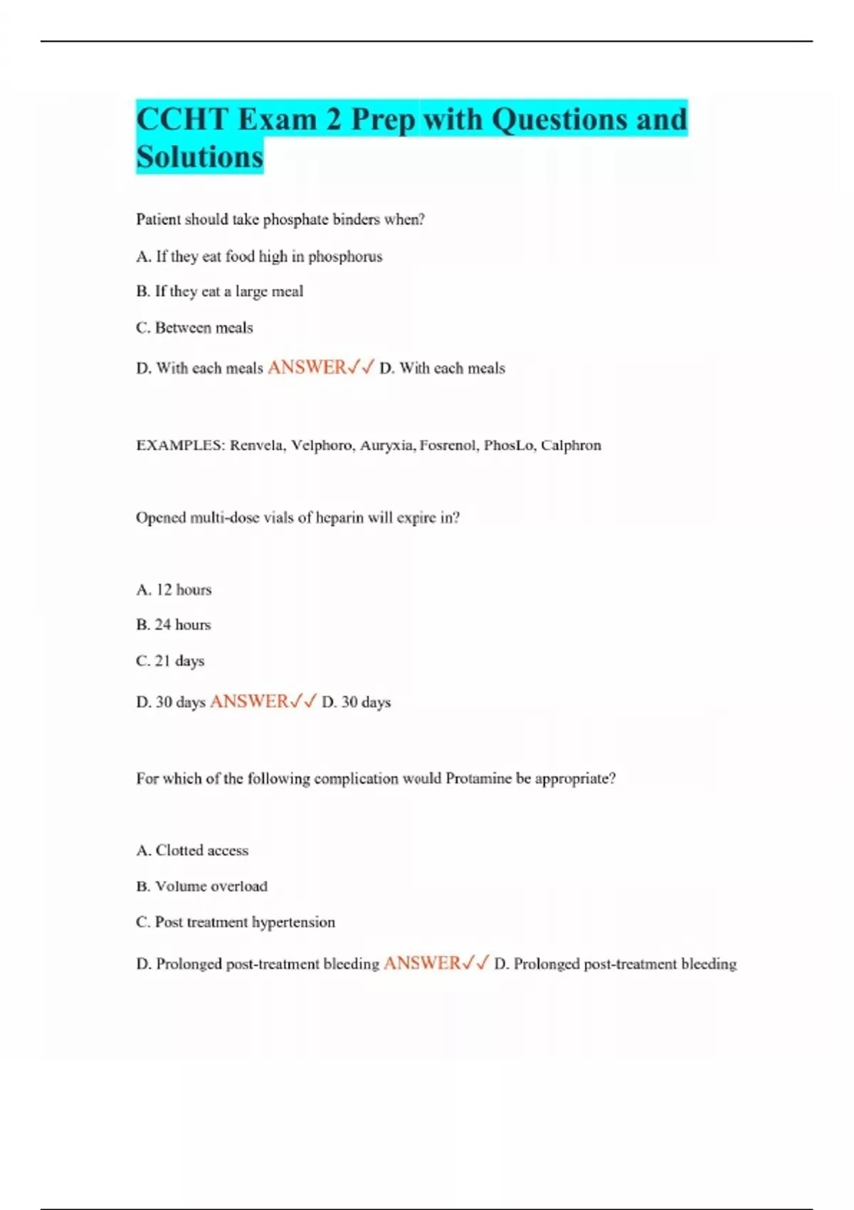 CCHT Exam 2 Prep with Questions and Solutions Patient should take phosphate binders when? A. If they eat food high in phosphorus B. If they eat a large meal C. Between meals D. With each meals ANSWER D. With each meals EXAMPLES: Renvela, Velphoro, Auryxia, Fosrenol, PhosLo, Calphron Opened multi-dose vials of heparin will expire in? A. 12 hours B. 24 hours C. 21 days D. 30 days ANSWER D. 30 days For which of the following complication would Protamine be appropriate? A. Clotted access B. Volume overload C. Post treatment hypertension D. Prolonged post-treatment bleeding ANSWER D. Prolonged post-treatment bleeding