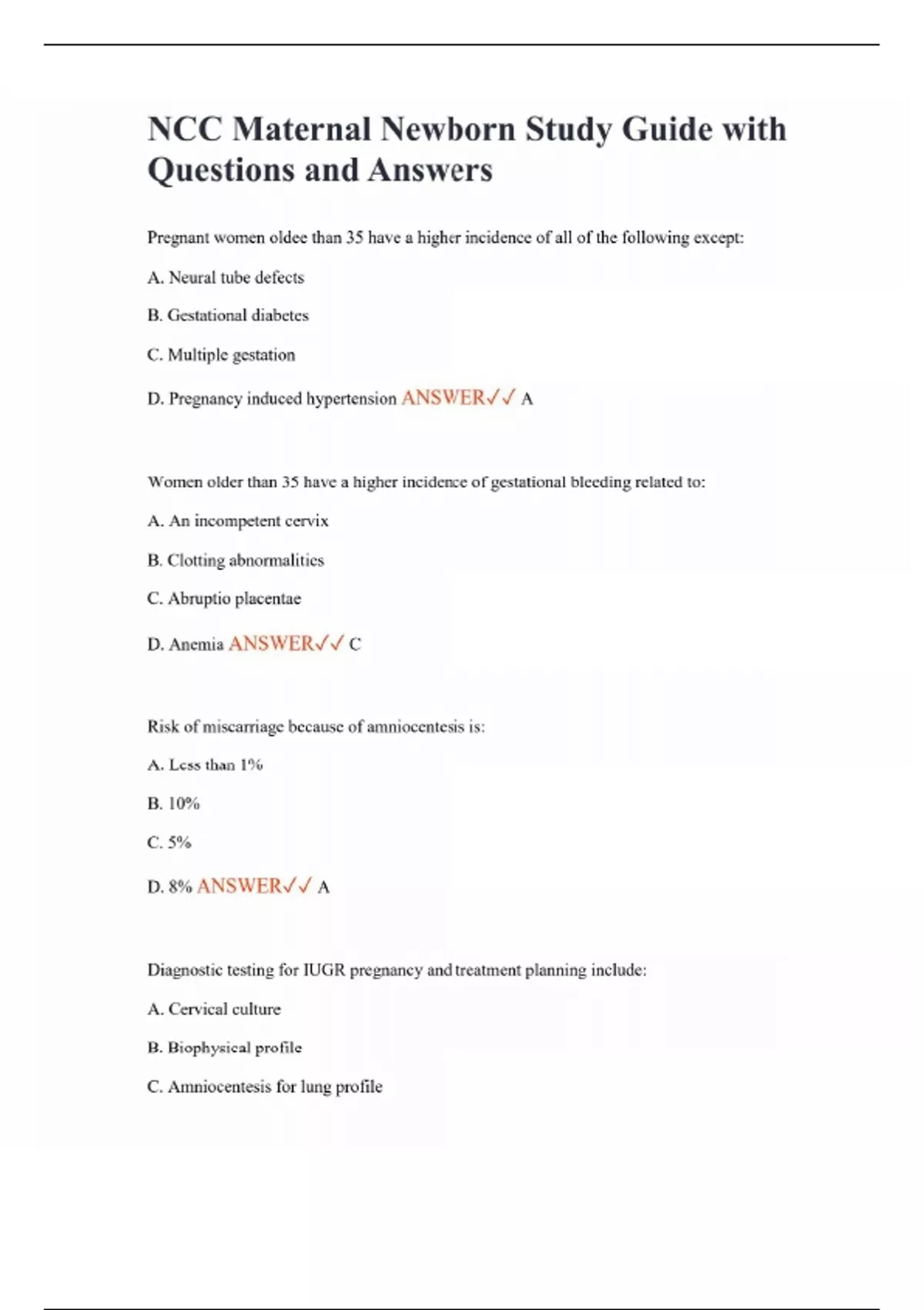 NCC Maternal Newborn Study Guide with Questions and Answers Pregnant women oldee than 35 have a higher incidence of all of the following except: A. Neural tube defects B. Gestational diabetes C. Multiple gestation D. Pregnancy induced hypertension ANSWER A Women older than 35 have a higher incidence of gestational bleeding related to: A. An incompetent cervix B. Clotting abnormalities C. Abruptio placentae D. Anemia ANSWER C Risk of miscarriage because of amniocentesis is: A. Less than 1% B. 10% C. 5% D. 8% ANSWER A Diagnostic testing for IUGR pregnancy and treatment planning include: A. Cervical culture B. Biophysical profile C. Amniocentesis for lung profile