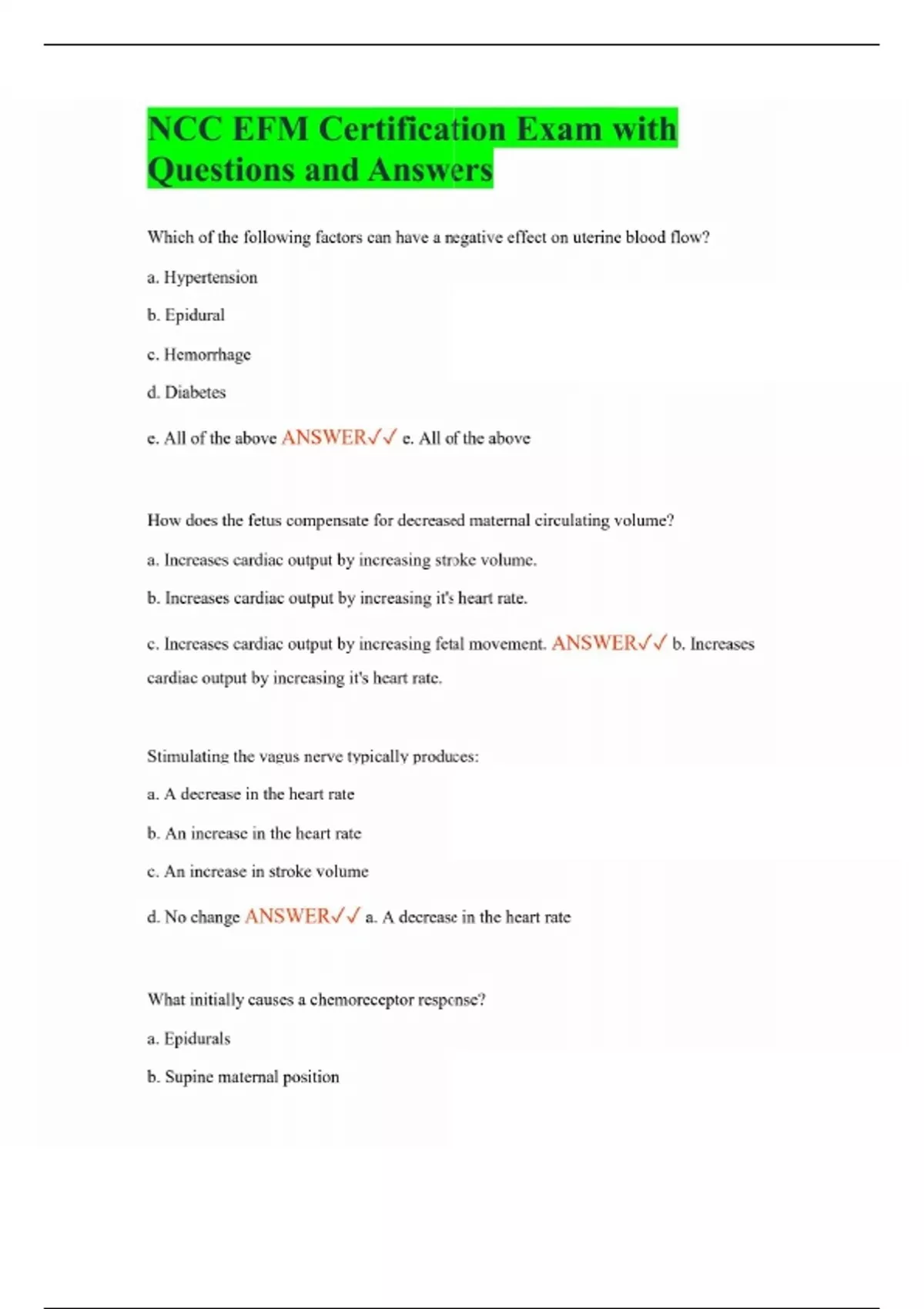NCC EFM Certification Exam with Questions and Answers Which of the following factors can have a negative effect on uterine blood flow? a. Hypertension b. Epidural c. Hemorrhage d. Diabetes e. All of the above ANSWER e. All of the above How does the fetus compensate for decreased maternal circulating volume? a. Increases cardiac output by increasing stroke volume. b. Increases cardiac output by increasing it's heart rate. c. Increases cardiac output by increasing fetal movement. ANSWER b. Increases cardiac output by increasing it's heart rate. Stimulating the vagus nerve typically produces: a. A decrease in the heart rate b. An increase in the heart rate c. An increase in stroke volume d. No change ANSWER a. A decrease in the heart rate What initially causes a chemoreceptor response? a. Epidurals b. Supine maternal position