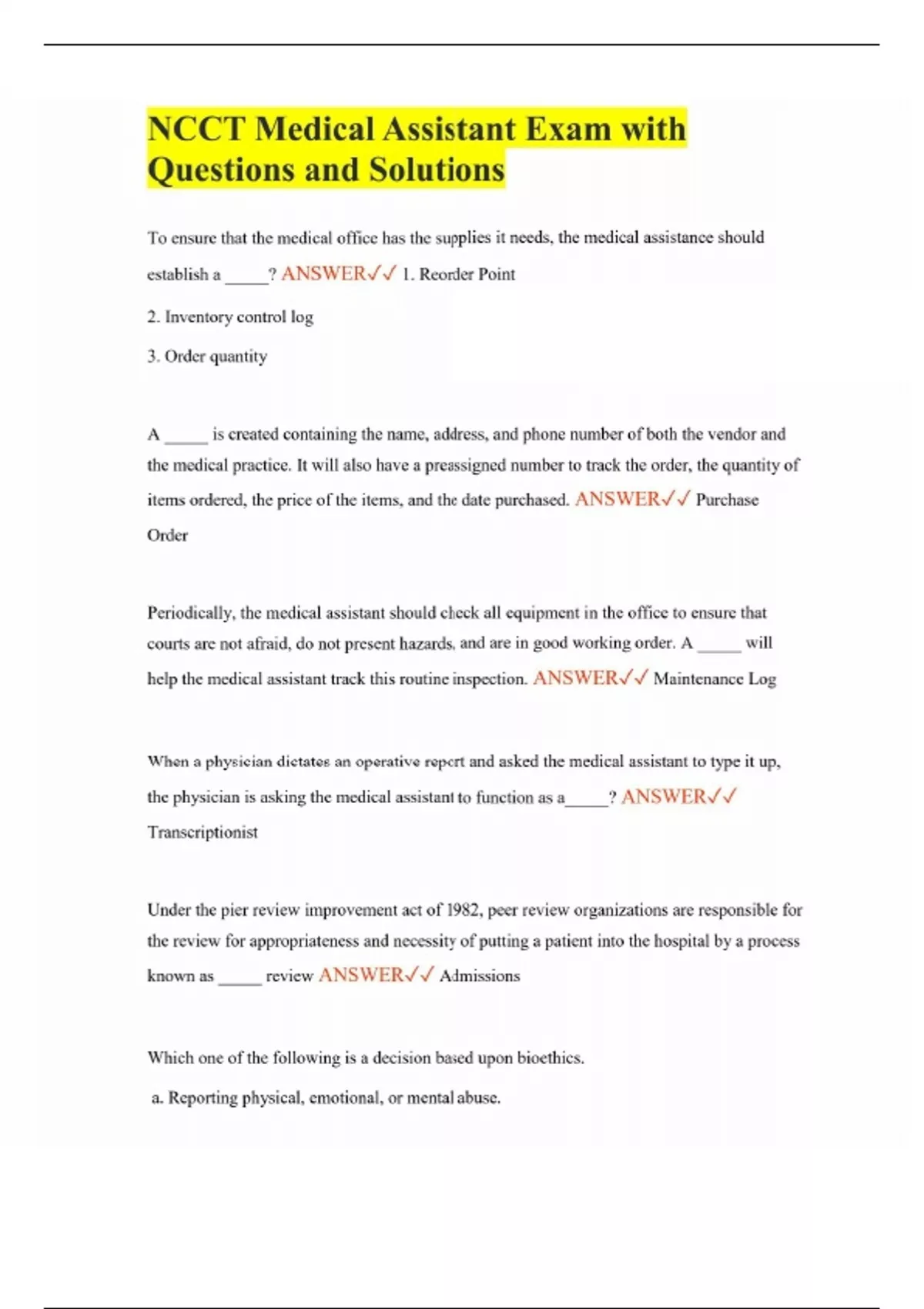 NCCT Medical Assistant Exam with Questions and Solutions To ensure that the medical office has the supplies it needs, the medical assistance should establish a _____? ANSWER 1. Reorder Point 2. Inventory control log 3. Order quantity A _____ is created containing the name, address, and phone number of both the vendor and the medical practice. It will also have a preassigned number to track the order, the quantity of items ordered, the price of the items, and the date purchased. ANSWER Purchase Order Periodically, the medical assistant should check all equipment in the office to ensure that courts are not afraid, do not present hazards, and are in good working order. A _____ will help the medical assistant track this routine inspection. ANSWER Maintenance Log When a physician dictates an operative report and asked the medical assistant to type it up, the physician is asking the medical assistant to function as a_____? ANSWER Transcriptionist Under the pier review improvement act of 1982, peer review organizations are responsible for the review for appropriateness and necessity of putting a patient into the hospital by a process known as _____ review ANSWER Admissions Which one of the following is a decision based upon bioethics. a. Reporting physical, emotional, or mental abuse.