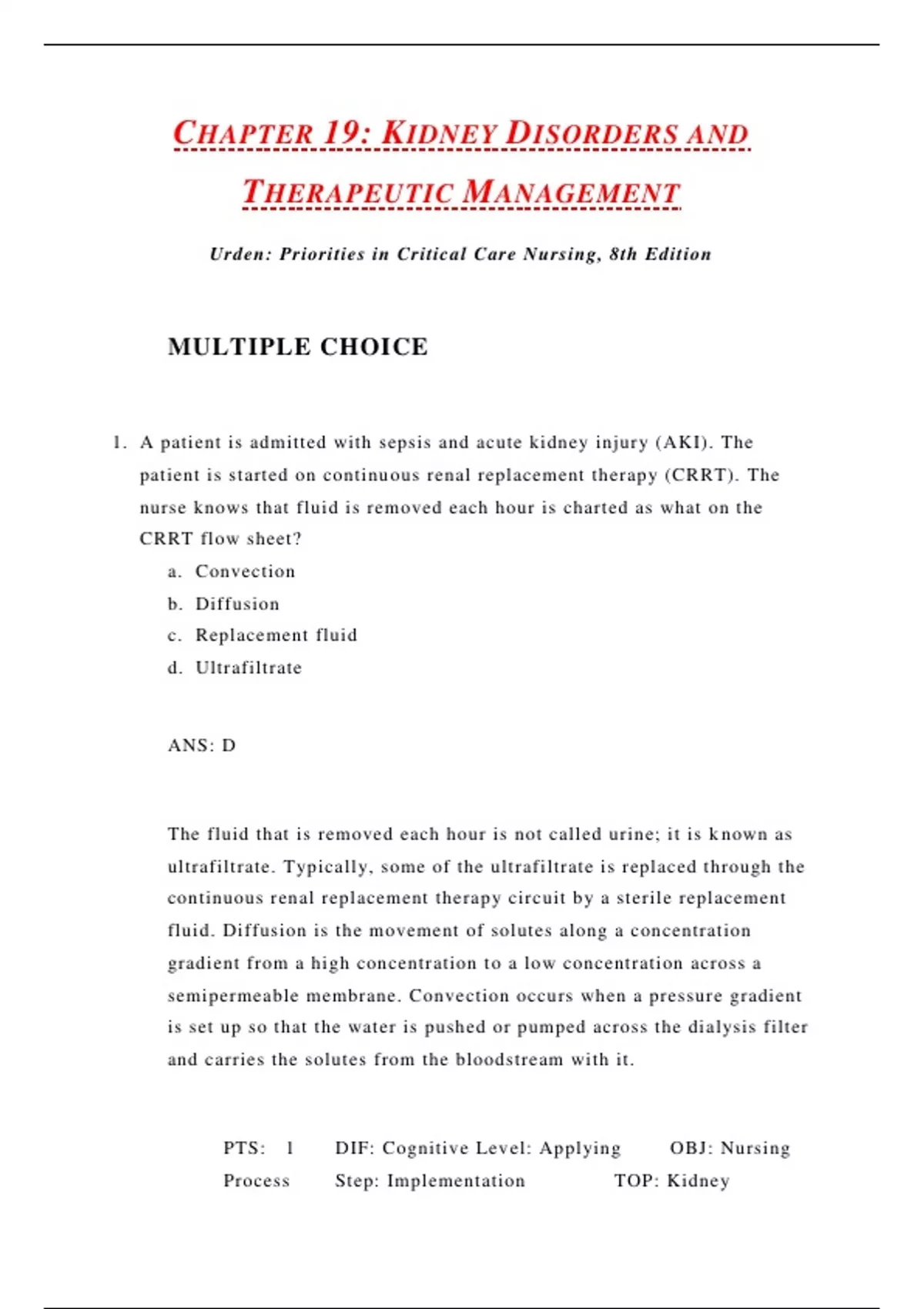 Urden: Priorities in Critical Care Nursing, 8th Edition MULTIPLE CHOICE 1. A patient is admitted with sepsis and acute kidney injury (AKI). The patient is started on continuous renal replacement therapy (CRRT). The nurse knows that fluid is removed each hour is charted as what on the CRRT flow sheet? a. Convection b. Diffusion c. Replacement fluid d. Ultrafiltrate ANS: D The fluid that is removed each hour is not called urine; it is known as ultrafiltrate. Typically, some of the ultrafiltrate is replaced through the continuous renal replacement therapy circuit by a sterile replacement fluid. Diffusion is the movement of solutes along a concentration gradient from a high concentration to a low concentration across a semipermeable membrane. Convection occurs when a pressure gradient is set up so that the water is pushed or pumped across the dialysis filter and carries the solutes from the bloodstream with it. PTS: 1 DIF: Cognitive Level: Applying OBJ: Nursing Process Step: Implementation TOP: Kidney Disorders and Therapeutic Management MSC: NCLEX: Physiological Integrity: Reduction of Risk Potential 2. What is the most common site for short-term vascular access for immediate hemodialysis? a. Subclavian artery b. Subclavian vein c. Femoral artery d. Radial vein ANS: B Subclavian and femoral veins are catheterized when short-term access is required or when a graft or fistula vascular access is nonfunctional in a patient requiring immediate hemodialysis. Subclavian and femoral catheters are routinely inserted at the bedside. Most temporary catheters are venous lines only. Blood flows out toward the dialyzer and flows back to the patient through the same catheterized vein. A dual-lumen venous catheter is most commonly used. PTS: 1 DIF: Cognitive Level: Understanding OBJ: Nursing Process Step: Planning TOP: Kidney Disorders and Therapeutic Management MSC: NCLEX: Physiological Integrity: Reduction of Risk Potential 3. The practitioner has ordered dialysis for a patient with acute heart failure who is unresponsive to diuretics. Which type of dialysis would the nurse anticipate being started on this patient? a. Intermittent ultrafiltration b. Continuous venovenous hemofiltration (CVVH) c. Continuous venovenous hemodialysis (CVVHD) d. Continuous venovenous hemodiafiltration (CVVHDF)