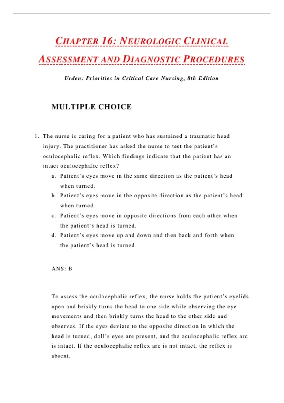 Urden: Priorities in Critical Care Nursing, 8th Edition MULTIPLE CHOICE 1. The nurse is caring for a patient who has sustained a traumatic head injury. The practitioner has asked the nurse to test the patient’s oculocephalic reflex. Which findings indicate that the patient has an intact oculocephalic reflex? a. Patient’s eyes move in the same direction as the patient’s head when turned. b. Patient’s eyes move in the opposite direction as the patient’s head when turned. c. Patient’s eyes move in opposite directions from each other when the patient’s head is turned. d. Patient’s eyes move up and down and then back and forth when the patient’s head is turned. ANS: B To assess the oculocephalic reflex, the nurse holds the patient’s eyelids open and briskly turns the head to one side while observing the eye movements and then briskly turns the head to the other side and observes. If the eyes deviate to the opposite direction in which the head is turned, doll’s eyes are present, and the oculocephalic reflex arc is intact. If the oculocephalic reflex arc is not intact, the reflex is absent. PTS: 1 DIF: Cognitive Level: Applying OBJ: Nursing Process Step: Assessment TOP: Neurologic Clinical Assessment and Diagnostic Procedures MSC: NCLEX: Health Promotion and Maintenance 2. The nurse is precepting a new graduate nurse. The new graduate asks about testing the oculovestibular reflex. What should the nurse tell the new graduate? a. “The test should not be performed on an unconscious patient because of the risk of aspiration.” b. “An abnormal response is manifested by conjugate, slow, tonic nystagmus, deviating toward the irrigated ear.” c. “This test should be included in the nursing neurologic examination of a patient with a head injury.” d. “This test is performed by the practitioner and one of the final clinical assessments of brainstem function.” ANS: D The oculovestibular reflex is one of the final clinical assessments of brainstem function and is only performed by a practitioner. In a normal response, eye movement is in the direction of the injection site. An abnormal response is disconjugate eye movement, which indicates a brainstem lesion, or no response, which indicates little to no brainstem function. PTS: 1 DIF: Cognitive Level: Applying OBJ: Nursing Process Step: Assessment TOP: Neurologic Clinical Assessment and Diagnostic Procedures MSC: NCLEX: Health Promotion and Maintenance 3. The nurse is caring for a patient with a head injury and observes a rhythmic increase and decrease in the rate and depth of respiration followed by brief periods of apnea. What should the nurse document under breathing pattern? a. Central neurogenic hyperventilation b. Apneustic breathing c. Ataxic respirations d. Cheyne-Stokes respirations
