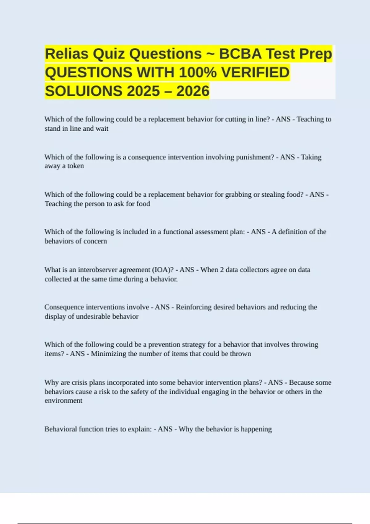 Relias Quiz ~ BCBA Test Prep QUESTIONS WITH 100% VERIFIED SOLUTIONS 2025 – 2026