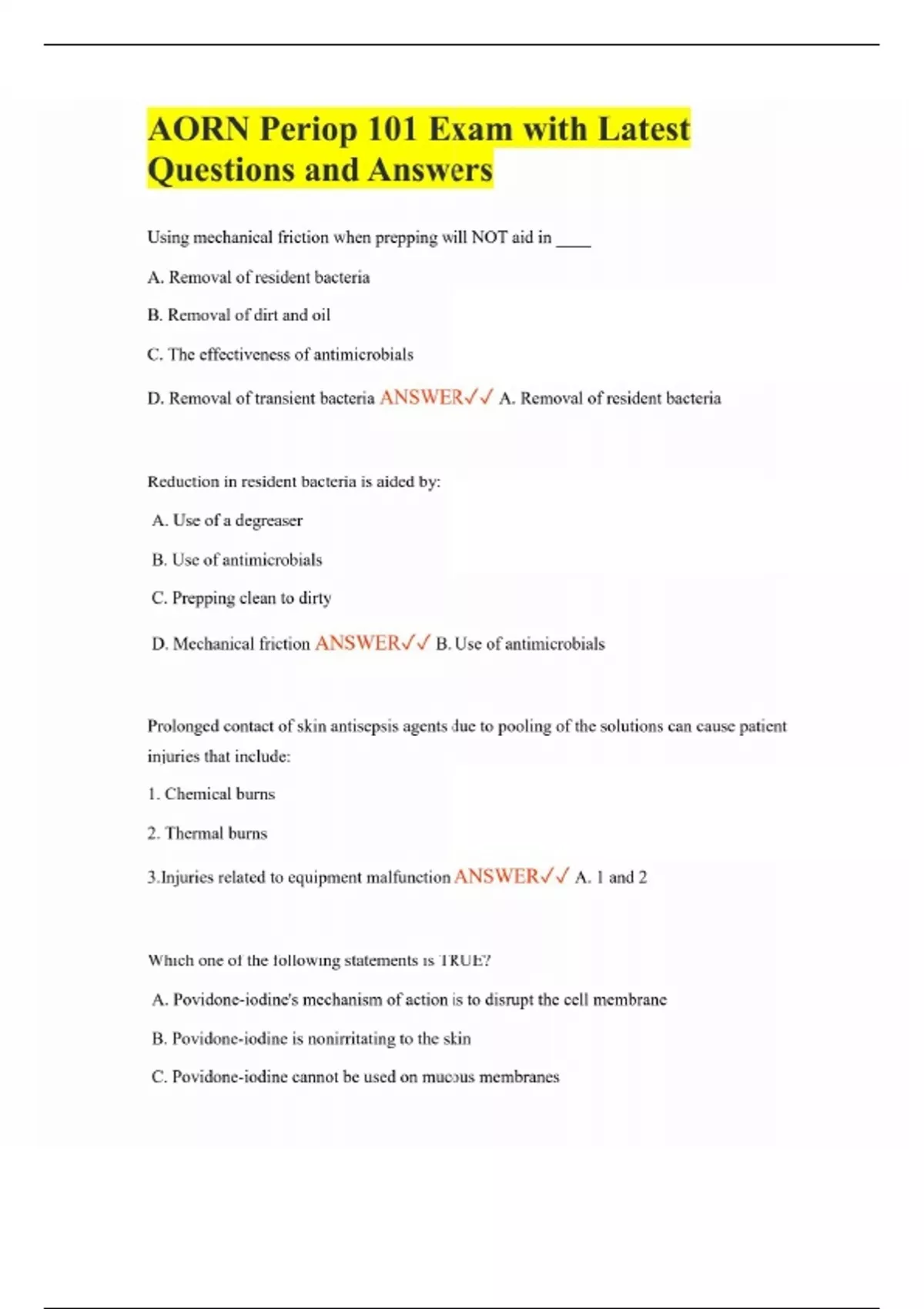 AORN Periop 101 Exam with Latest Questions and Answers Using mechanical friction when prepping will NOT aid in ____ A. Removal of resident bacteria B. Removal of dirt and oil C. The effectiveness of antimicrobials D. Removal of transient bacteria ANSWER A. Removal of resident bacteria Reduction in resident bacteria is aided by: A. Use of a degreaser B. Use of antimicrobials C. Prepping clean to dirty D. Mechanical friction ANSWER B. Use of antimicrobials Prolonged contact of skin antisepsis agents due to pooling of the solutions can cause patient injuries that include: 1. Chemical burns 2. Thermal burns 3.Injuries related to equipment malfunction ANSWER A. 1 and 2 Which one of the following statements is TRUE? A. Povidone-iodine's mechanism of action is to disrupt the cell membrane B. Povidone-iodine is nonirritating to the skin C. Povidone-iodine cannot be used on mucous membranes