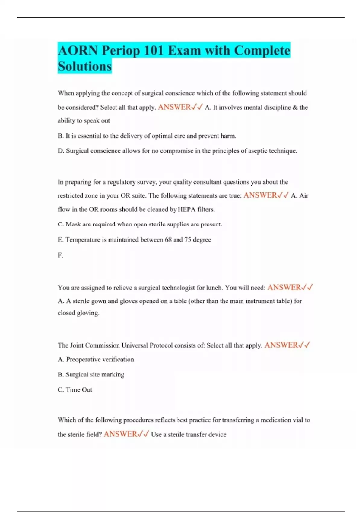 AORN Periop 101 Exam with Complete Solutions When applying the concept of surgical conscience which of the following statement should be considered? Select all that apply. ANSWER A. It involves mental discipline & the ability to speak out B. It is essential to the delivery of optimal care and prevent harm. D. Surgical conscience allows for no compromise in the principles of aseptic technique. In preparing for a regulatory survey, your quality consultant questions you about the restricted zone in your OR suite. The following statements are true: ANSWER A. Air flow in the OR rooms should be cleaned by HEPA filters. C. Mask are required when open sterile supplies are present. E. Temperature is maintained between 68 and 75 degree F. You are assigned to relieve a surgical technologist for lunch. You will need: ANSWER A. A sterile gown and gloves opened on a table (other than the main instrument table) for closed gloving. The Joint Commission Universal Protocol consists of: Select all that apply. ANSWER A. Preoperative verification B. Surgical site marking C. Time Out Which of the following procedures reflects best practice for transferring a medication vial to the sterile field? ANSWER Use a sterile transfer device