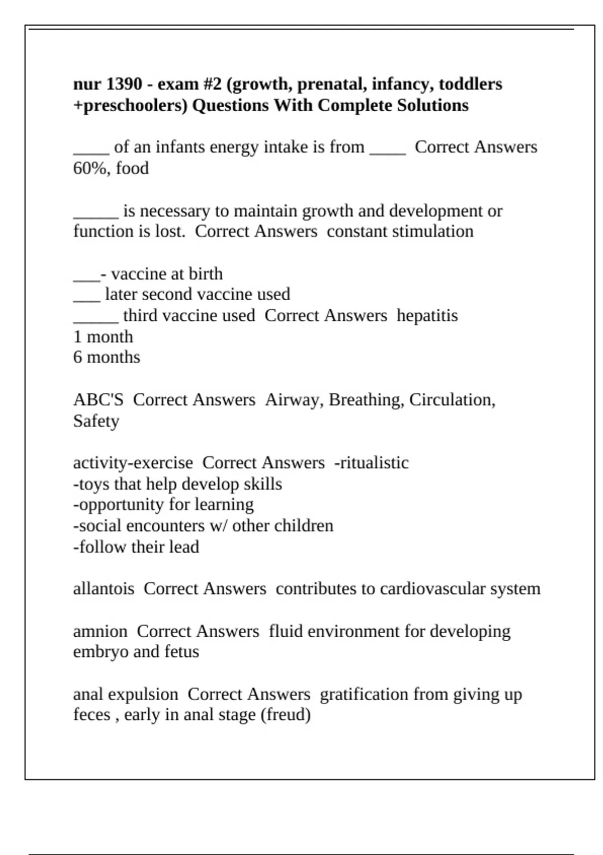 nur 1390 - exam #2 (growth, prenatal, infancy, toddlers +preschoolers) Questions With Complete Solutions