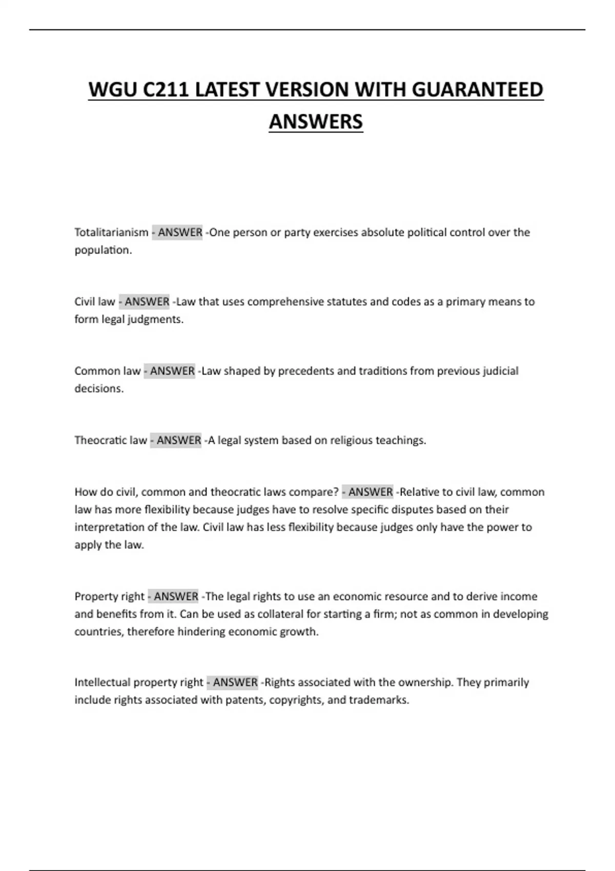 Civil law - ANSWER -Law that uses comprehensive statutes and codes as a primary means to