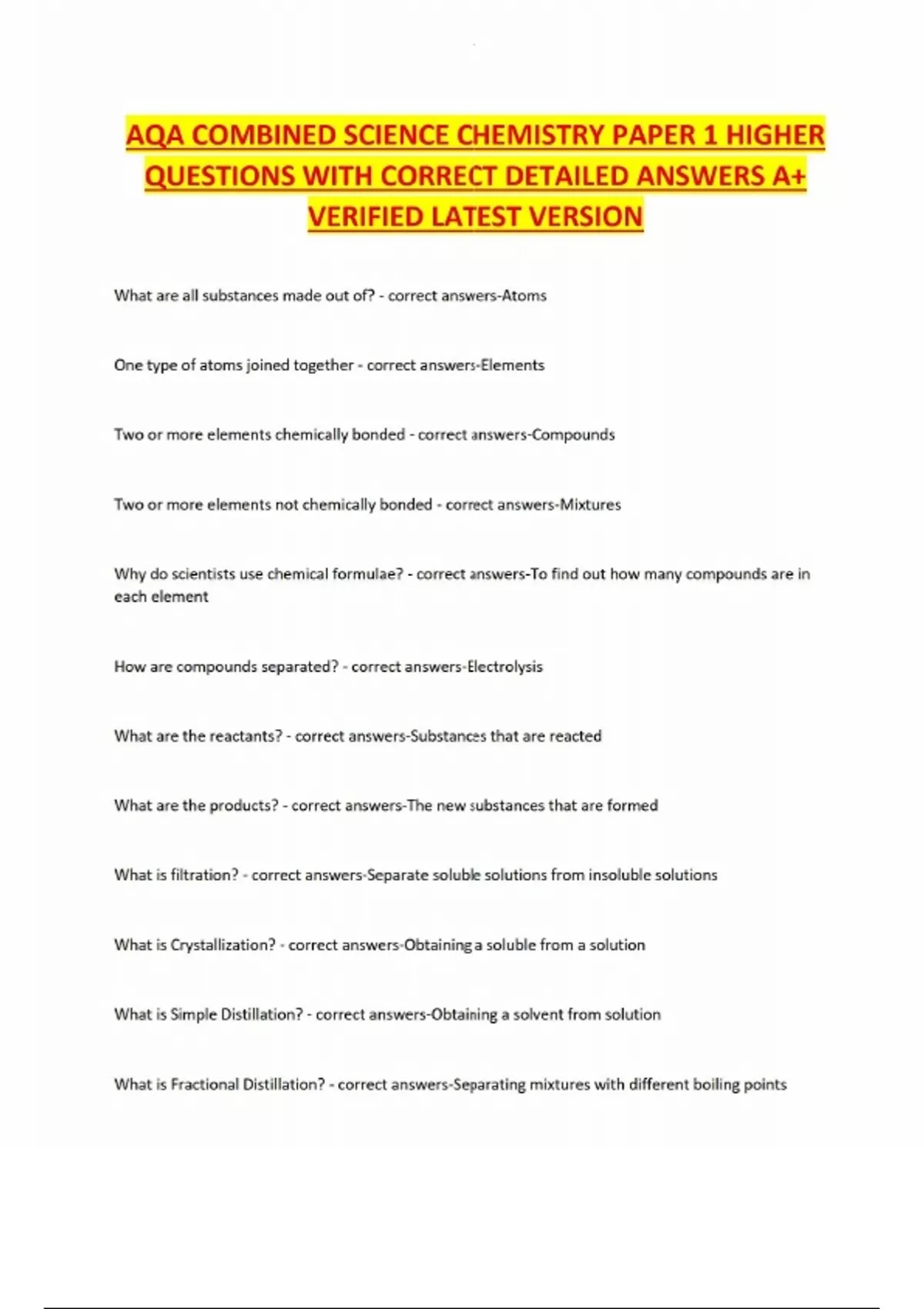 AQA COMBINED SCIENCE CHEMISTRY PAPER 1 HIGHER QUESTIONS WITH CORRECT DETAILED ANSWERS A+ VERIFIED LATEST VERSION