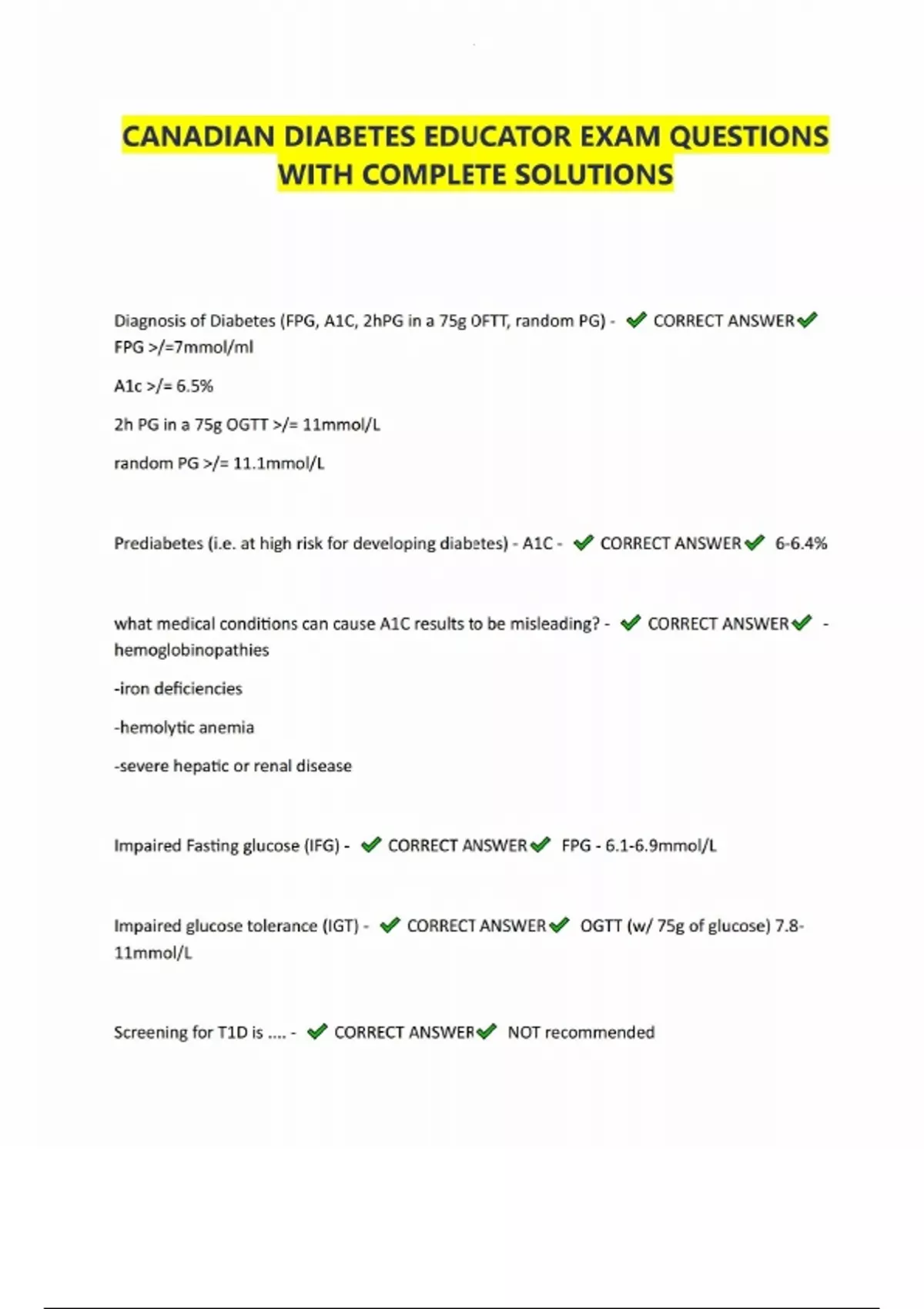 This document contains a comprehensive collection of practice questions and complete solutions tailored for the Canadian Diabetes Educator Certification Exam. It covers key areas including diabetes pathophysiology, pharmacological and non-pharmacological treatments, patient education, nutrition, and chronic disease management. Designed according to current Canadian guidelines, this resource is ideal for exam preparation and self-assessment.