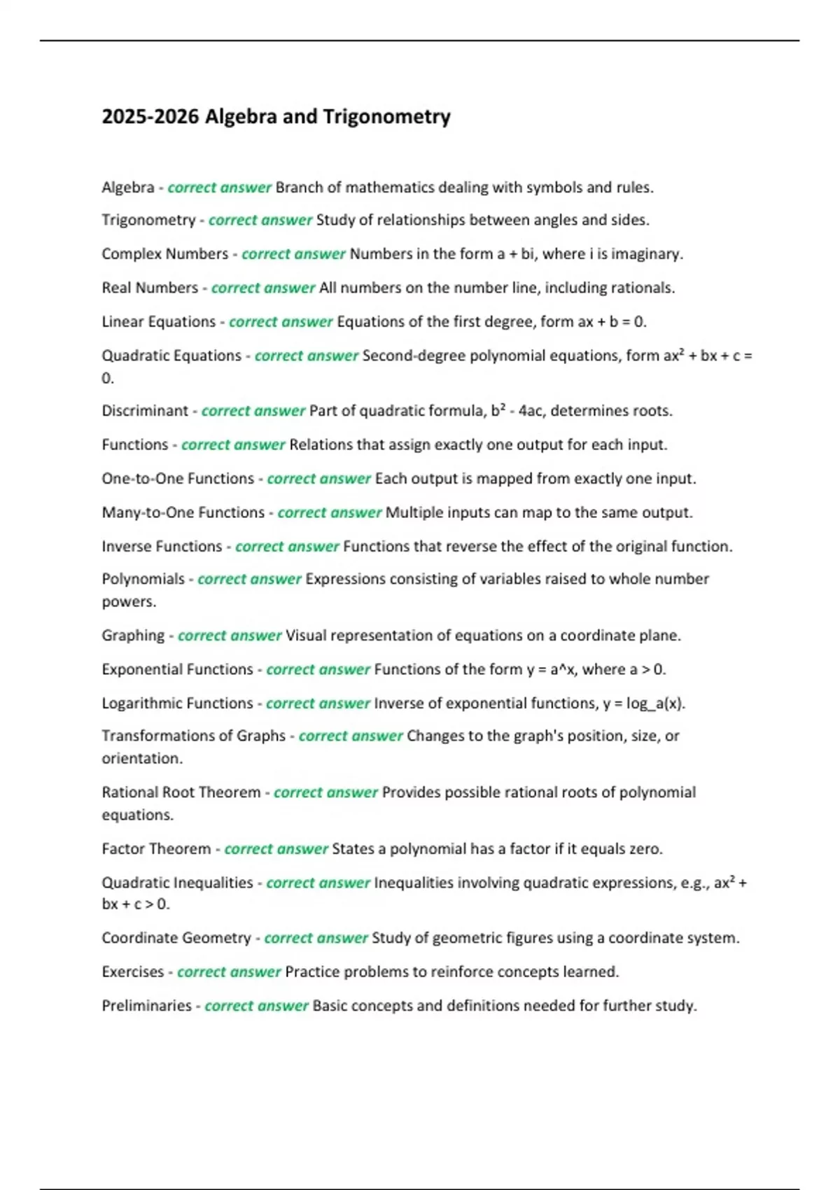 Algebra - correct answer Branch of mathematics dealing with symbols and rules. Trigonometry - correct answer Study of relationships between angles and sides. Complex Numbers - correct answer Numbers in the form a + bi, where i is imaginary. Real Numbers - correct answer All numbers on the number line, including rationals. Linear Equations - correct answer Equations of the first degree, form ax + b = 0. Quadratic Equations - correct answer Second-degree polynomial equations, form ax² + bx + c = 0. Discriminant - correct answer Part of quadratic formula, b² - 4ac, determines roots. Functions - correct answer Relations that assign exactly one output for each input.