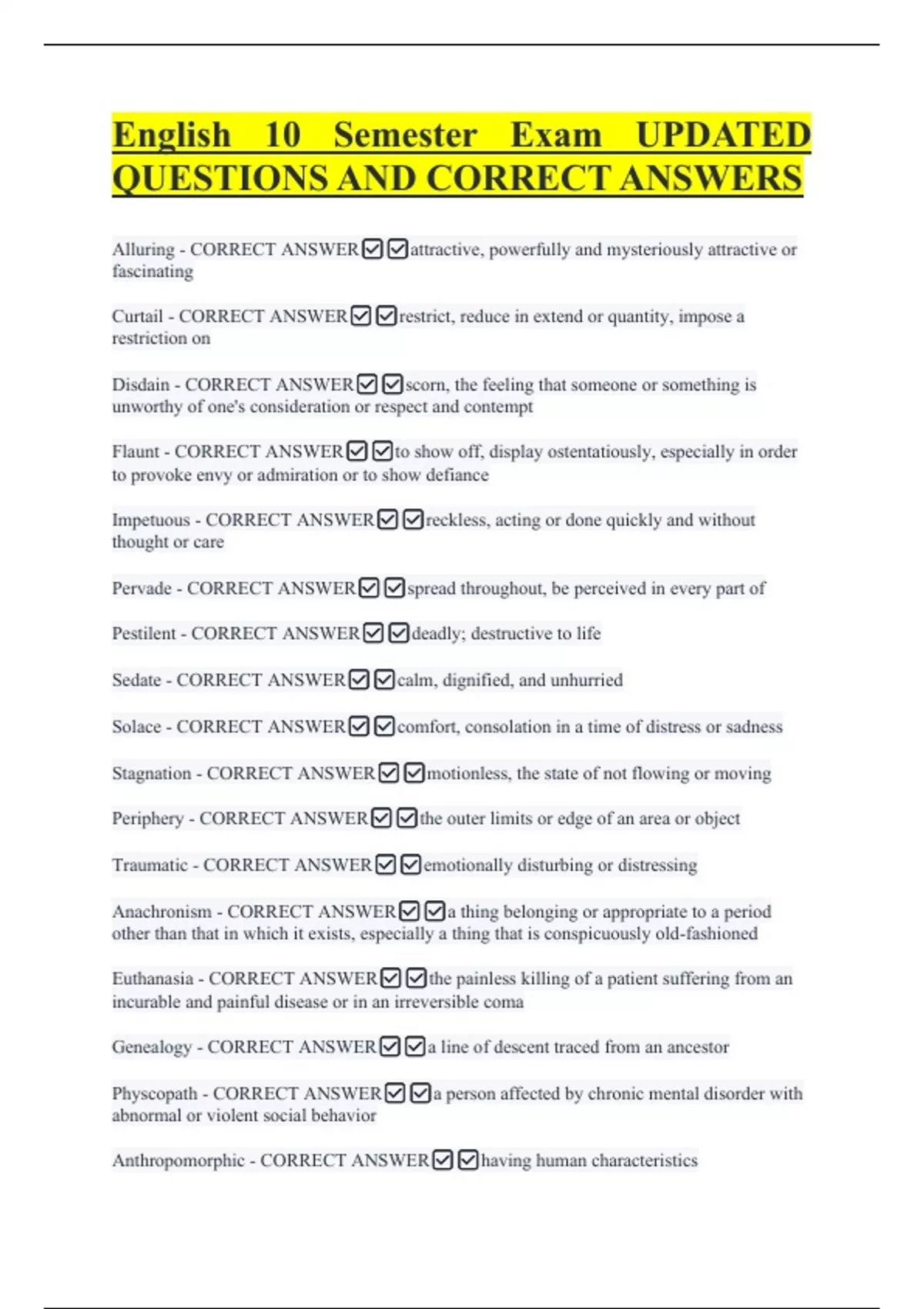 English 10 Semester Exam UPDATED QUESTIONS AND CORRECT ANSWERS Alluring - CORRECT ANSWERattractive, powerfully and mysteriously attractive or fascinating Curtail - CORRECT ANSWERrestrict, reduce in extend or quantity, impose a restriction on Disdain - CORRECT ANSWERscorn, the feeling that someone or something is unworthy of one's consideration or respect and contempt Flaunt - CORRECT ANSWERto show off, display ostentatiously, especially in order to provoke envy or admiration or to show defiance