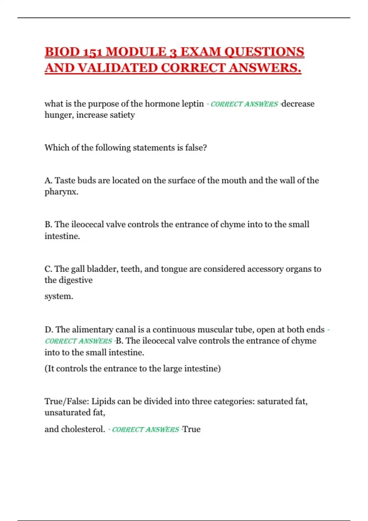what is the purpose of the hormone leptin - CorreCt Answers -decrease hunger, increase satiety Which of the following statements is false? A. Taste buds are located on the surface of the mouth and the wall of the pharynx. B. The ileocecal valve controls the entrance of chyme into to the small intestine. C. The gall bladder, teeth, and tongue are considered accessory organs to the digestive system. D. The alimentary canal is a continuous muscular tube, open at both ends - CorreCt Answers -B. The ileocecal valve controls the entrance of chyme into to the small intestine. (It controls the entrance to the large intestine) True/False: Lipids can be divided into three categories: saturated fat, unsaturated fat, and cholesterol. - CorreCt Answers -TrueTrue/False: Anabolism combines smaller molecules to make larger molecules - CorreCt Answers -True