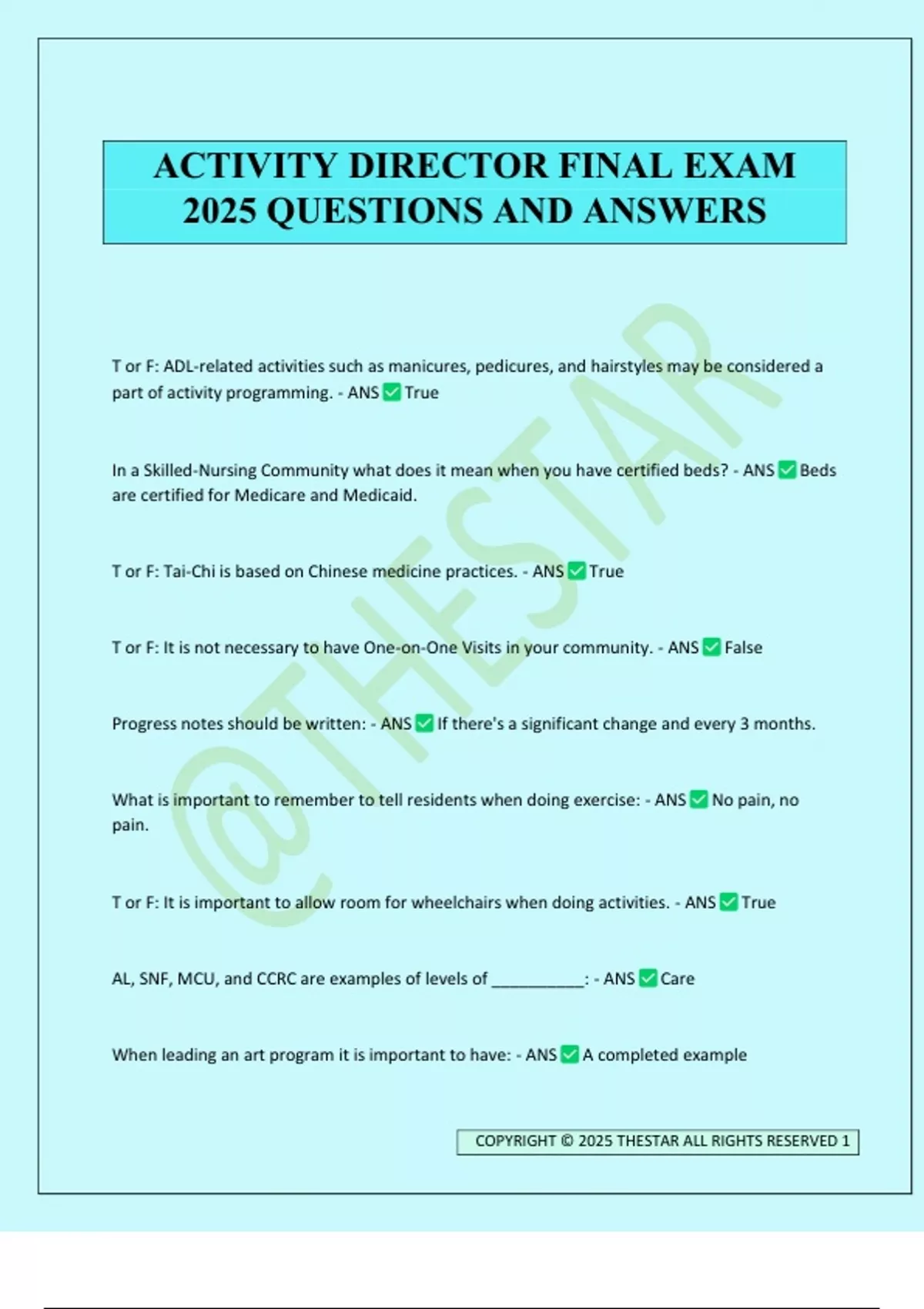 T or F: ADL-related activities such as manicures, pedicures, and hairstyles may be considered a part of activity programming. - ANS True In a Skilled-Nursing Community what does it mean when you have certified beds? - ANS Beds are certified for Medicare and Medicaid. T or F: Tai-Chi is based on Chinese medicine practices. - ANS True T or F: It is not necessary to have One-on-One Visits in your community. - ANS False Progress notes should be written: - ANS If there's a significant change and every 3 months. What is important to remember to tell residents when doing exercise: - ANS No pain, no pain. T or F: It is important to allow room for wheelchairs when doing activities. - ANS True AL, SNF, MCU, and CCRC are examples of levels of __________: - ANS Care When leading an art program it is important to have: - ANS A completed example ACTIVITY DIRECTOR FINAL EXAM 2025 QUESTIONS AND ANSWERS COPYRIGHT © 2025 THESTAR ALL RIGHTS RESERVED 2 What is important when doing activities for seniors? - ANS Balance How should you seat residents during activities? - ANS According to their functioning level What are good tools for marketing? - ANS Pictures What does CCRC stand for? - ANS Continuing Care Retirement Community T or F: It is important to hire a trained professional to lead your activities. - ANS True T or F: It is important to follow a resident's special diet. - ANS True __________________________________ is a means for residents to discuss and voice their concerns about their community. - ANS Resident Council T or F: Music reaches all parts of the brain. - ANS True What group of people does Inter-generational Programming include? - ANS Children/Youth What is the best way to retain volunteers? - ANS Say Thank You How many hours of planned programming must be on the Activity Calendar per week? - ANS 14 Hours o