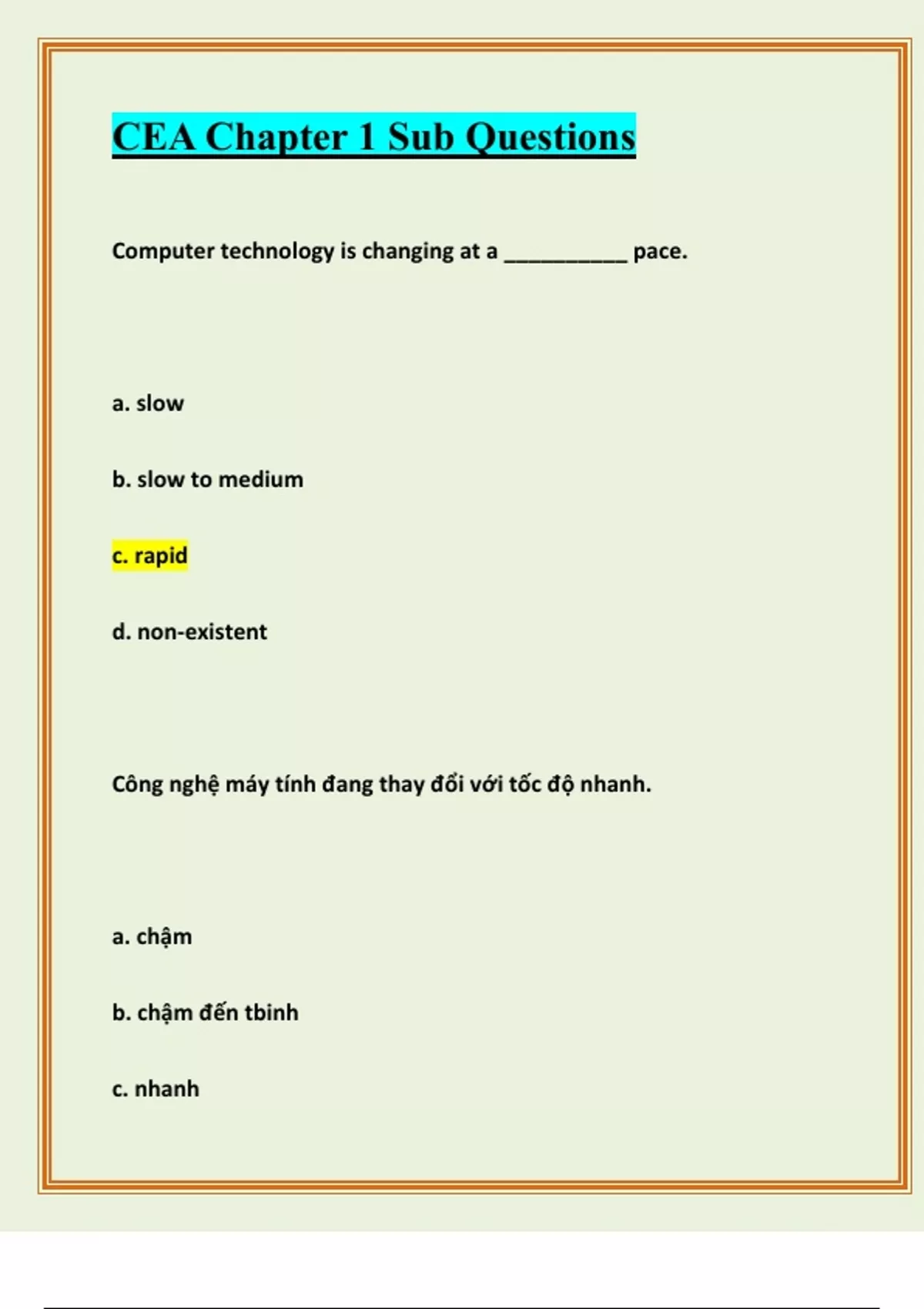 Computer technology is changing at a __________ pace. a. slow b. slow to medium c. rapid d. non-existent Công nghệ máy tính đang thay đổi với tốc độ nhanh. a. chậm b. chậm đến tbinh c. nhanhd. không tồn tại - ️ Correct Answer rapid