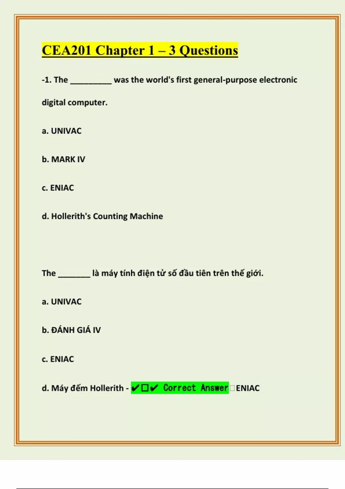 d. Máy đếm Hollerith - ✔️✔ Correct Answer ENIAC