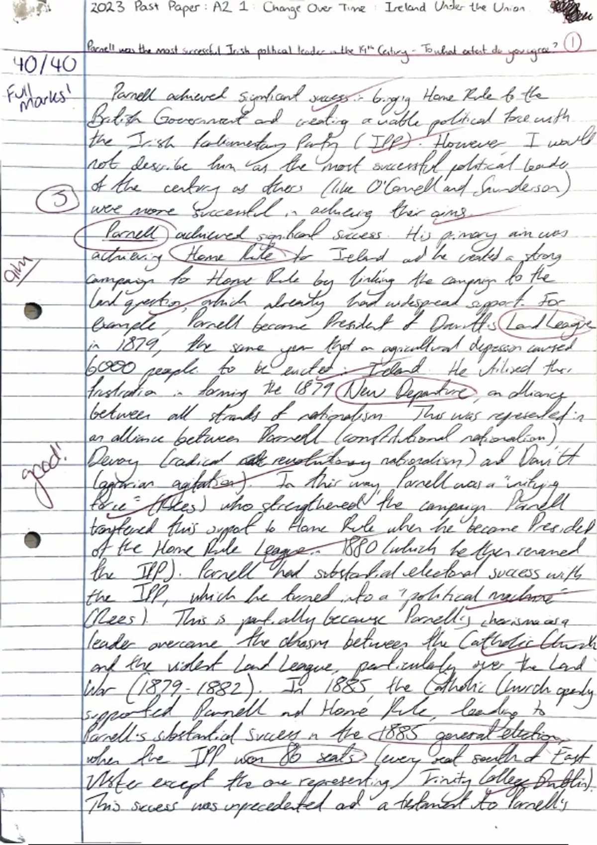 "Parnell was the most successful Irish political leader in the 19th Century- How far do you agree?". This is an essay for "Ireland Under the Union " as part of A Level History. This essay is fully annotated and received full marks (40/40). Happy studying!