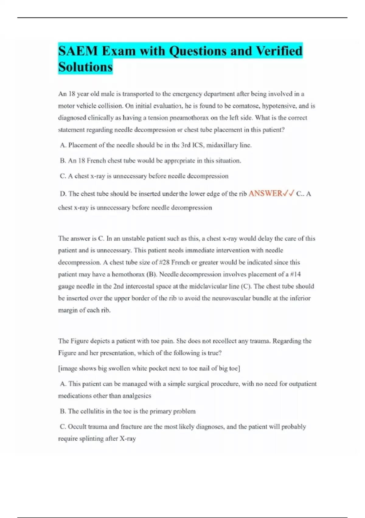 SAEM Exam with Questions and Verified Solutions An 18 year old male is transported to the emergency department after being involved in a motor vehicle collision. On initial evaluation, he is found to be comatose, hypotensive, and is diagnosed clinically as having a tension pneumothorax on the left side. What is the correct statement regarding needle decompression or chest tube placement in this patient? A. Placement of the needle should be in the 3rd ICS, midaxillary line. B. An 18 French chest tube would be appropriate in this situation. C. A chest x-ray is unnecessary before needle decompression D. The chest tube should be inserted under the lower edge of the rib ANSWER C.. A chest x-ray is unnecessary before needle decompression The answer is C. In an unstable patient such as this, a chest x-ray would delay the care of this patient and is unnecessary. This patient needs immediate intervention with needle decompression. A chest tube size of #28 French or greater would be indicated since this patient may have a hemothorax (B). Needle decompression involves placement of a #14 gauge needle in the 2nd intercostal space at the midclavicular line (C). The chest tube should be inserted over the upper border of the rib to avoid the neurovascular bundle at the inferior margin of each rib. The Figure depicts a patient with toe pain. She does not recollect any trauma. Regarding the Figure and her presentation, which of the following is true? [image shows big swollen white pocket next to toe nail of big toe] A. This patient can be managed with a simple surgical procedure, with no need for outpatient medications other than analgesics B. The cellulitis in the toe is the primary problem C. Occult trauma and fracture are the most likely diagnoses, and the patient will probably require splinting after X-ray