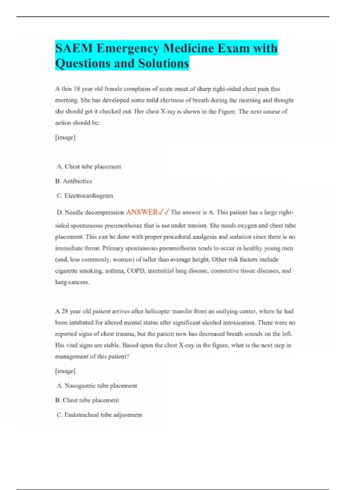 SAEM Emergency Medicine Exam with Questions and Solutions A thin 18 year old female complains of acute onset of sharp right-sided chest pain this morning. She has developed some mild shortness of breath during the morning and thought she should get it checked out. Her chest X-ray is shown in the Figure. The next course of action should be: [image] A. Chest tube placement B. Antibiotics C. Electrocardiogram D. Needle decompression ANSWER The answer is A. This patient has a large right-sided spontaneous pneumothorax that is not under tension. She needs oxygen and chest tube placement. This can be done with proper procedural analgesia and sedation since there is no immediate threat. Primary spontaneous pneumothorax tends to occur in healthy young men (and, less commonly, women) of taller than average height. Other risk factors include cigarette smoking, asthma, COPD, interstitial lung disease, connective tissue diseases, and lung cancers. A 28 year old patient arrives after helicopter transfer from an outlying center, where he had been intubated for altered mental status after significant alcohol intoxication. There were no reported signs of chest trauma, but the patient now has decreased breath sounds on the left. His vital signs are stable. Based upon the chest X-ray in the figure, what is the next step in management of this patient? [image] A. Nasogastric tube placement B. Chest tube placement C. Endotracheal tube adjustment