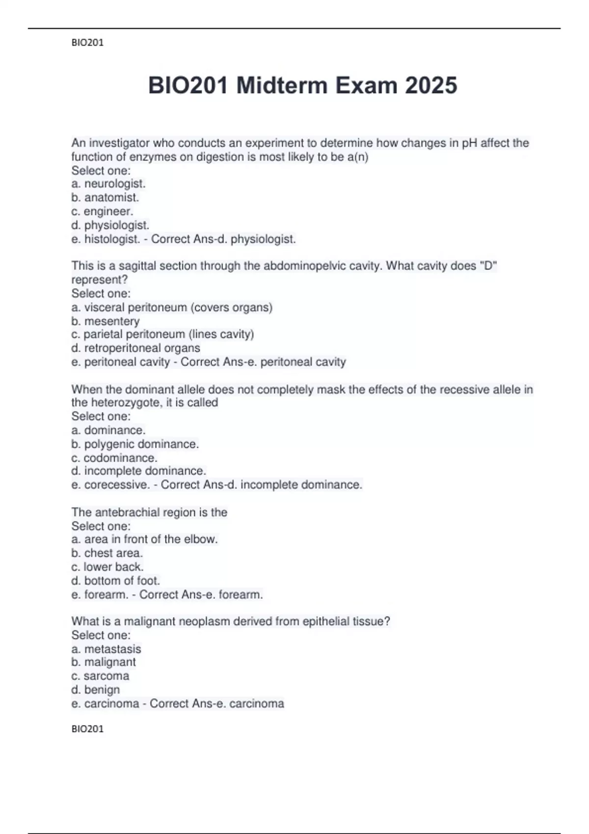 An investigator who conducts an experiment to determine how changes in pH affect the function of enzymes on digestion is most likely to be a(n) Select one: a. neurologist. b. anatomist. c. engineer. d. physiologist. e. histologist. - Correct Ans-d. physiologist. This is a sagittal section through the abdominopelvic cavity. What cavity does "D" represent? Select one: a. visceral peritoneum (covers organs) b. mesentery c. parietal peritoneum (lines cavity) d. retroperitoneal organs e. peritoneal cavity - Correct Ans-e. peritoneal cavity When the dominant allele does not completely mask the effects of the recessive allele in the heterozygote, it is called Select one: a. dominance. b. polygenic dominance. c. codominance. d. incomplete dominance. e. corecessive. - Correct Ans-d. incomplete dominance. The antebrachial region is the Select one: a. area in front of the elbow. b. chest area. c. lower back. d. bottom of foot. e. forearm. - Correct Ans-e. forearm. What is a malignant neoplasm derived from epithelial tissue? Select one: a. metastasis b. malignant c. sarcoma d. benign e. carcinoma - Correct Ans-e. carcinoma BIO201 BIO201 The process of meiosis will _____ as the gametes are produced. Select one: a. cut the chromosome number by 1/3 b. cut the chromosome number by 1/2 c. double the chromosome number d. not change the chromosome number e. triple the chromosome number - Correct Ans-b. cut the chromosome number by 1/2 When ionic compounds dissolve in water, their ions Select one: a. cling tightly together. b. dissociate or separate from one another. c. lose their charge. d. get lost in the solvent. e. settle to the bottom of the container. - Correct Ans-b. dissociate or separate from one another. Synovial fluid Select one: a. lacks cells. b. is found between all bony junctions. c. increases friction between bones. d. is produced by articular cartilage. e. decreases friction between bones. - Correct Ans-e. decreases friction between bones. This is the dermal layer closest to the epidermis. Select one: a. epidermis b. reticular layer c. papillary layer d. stretch marks e. hypodermis - Correct Ans-c. papillary layer Which of the following is not a characteristic of age-related changes at the tissue level? Select one: a. arterial walls become less elastic b. injuries heal rapidly and more completely in older people c. reduced flexibility and elasticity of connective tissue d. development of atherosclerosis e. rate of red blood cell synthesis declines - Correct Ans-b. injuries heal rapidly and more completely in older people The actual genetic constitution of an individual is its Select one: BIO201 BIO201 a. structural gene. b. autosome. c. genotype. d. polygenic. e. y-linked. - Correct Ans-c. genotype. Active transport Select one: a. follows osmotic pressure gradients. b. can move substances along their concentration gradient. c. does not require metabolic energy (ATP). d. involves vesicle formation. e. requires ATP. - Correct Ans-e. requires ATP. Normal pH for blood is 7.35 to 7.45. Maintenance of the pH in this range is Select one: a. critical because enzymes work best within narrow ranges of pH. b. not critical because extreme pH values do not affect enzyme function. c. called denaturation. d. not required. e. None of these choices is correct. - Correct Ans-a. critical because enzymes work best within narrow ranges of pH. Ringworm is an infection of the skin, hair, and nails caused by a Select one: a. bacterium. b. virus. c. parasite. d. fungus. e. inflammation. - Correct Ans-d. fungus. In the anatomical position, the Select one: a. arms are crossed over the chest. b. palms of the hands face posteriorly. c. body is erect with the head turned to the right. d. thumbs point to the midline of the body. e. palms of the hands face anteriorly. - Correct Ans-e. palms of the hands face anteriorly. Fingerprints and footprints are produced by projections into the epidermis called Select one: a. dermal striae. b. cleavage lines. c. reticular lines. d. melanocytes. BIO201 BIO201 e. dermal papillae. - Correct Ans-e. dermal papillae. The integumentary system has many functions, one of which is Select one: a. protection from cancer. b. production of Vitamin E. c. detection of heat and touch. d. regulation of acid-base balance. e. prevention of albinism. - Correct Ans-c. detection of heat and touch. Which of the following is not a coxal bone? Select one: a. ischium b. femur c. ilium d. pubic - Correct Ans-b. femur Which of the following events occurs last in intramembranous ossification? Select one: a. Osteoprogenitor cells become osteoblasts. b. A membrane of delicate collagen fibers develops. c. Trabecular bone is formed. d. Periosteum is formed. e. Many tiny trabeculae of woven bone develop. - Correct Ans-c. Trabecular bone is formed. Which of the following types of joints is mismatched w