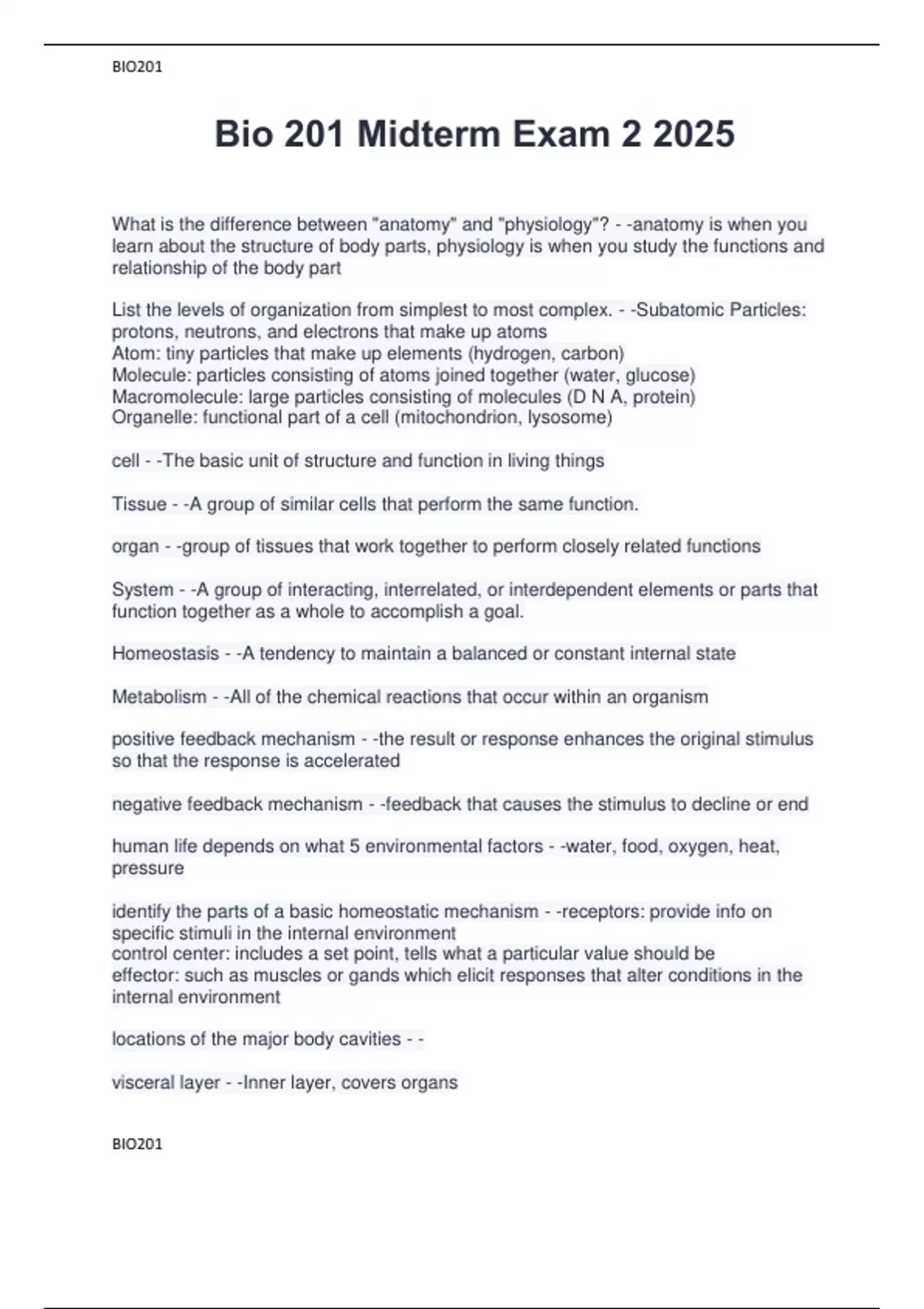 What is the difference between "anatomy" and "physiology"? - -anatomy is when you learn about the structure of body parts, physiology is when you study the functions and relationship of the body part List the levels of organization from simplest to most complex. - -Subatomic Particles: protons, neutrons, and electrons that make up atoms Atom: tiny particles that make up elements (hydrogen, carbon) Molecule: particles consisting of atoms joined together (water, glucose) Macromolecule: large particles consisting of molecules (D N A, protein) Organelle: functional part of a cell (mitochondrion, lysosome) cell - -The basic unit of structure and function in living things Tissue - -A group of similar cells that perform the same function. organ - -group of tissues that work together to perform closely related functions System - -A group of interacting, interrelated, or interdependent elements or parts that function together as a whole to accomplish a goal. Homeostasis - -A tendency to maintain a balanced or constant internal state Metabolism - -All of the chemical reactions that occur within an organism positive feedback mechanism - -the result or response enhances the original stimulus so that the response is accelerated negative feedback mechanism - -feedback that causes the stimulus to decline or end human life depends on what 5 environmental factors - -water, food, oxygen, heat, pressure identify the parts of a basic homeostatic mechanism - -receptors: provide info on specific stimuli in the internal environment control center: includes a set point, tells what a particular value should be effector: such as muscles or gands which elicit responses that alter conditions in the internal environment locations of the major body cavities - - visceral layer - -Inner layer, covers organs BIO201 BIO201 parietal layer - -outter layer, lines the internal surface of the body wall Atomical position - -body is erect, feet parallel, arms at sides with palms forward Identify the basic types of intercellular junctions. - - juntions ing junctions somes 4. hemidesmosomes 5. gap junctions List the 4 major types of tissue. Know the general characteristics of each basic type. Know the subcategories of each type and where those tissues can be located in the human body. - -epithelial: covers and lines budy structures; in addition to this covering/ lining function, some epithelial tissues may be specialized for secretion connective tissue: fills internal spaces, supports other tissues, transport materials and stores energy muscle tissue: specialized for contraction to produce some kind of movement ' nervous tissue: communicates and regulates by sending action potentials through the body endocrine glands - -Glands of the endocrine system that release hormones into the bloodstream exocrine glands - -secrete chemical substances into ducts that lead either to other organs or out of the body goblet cells - -a column-shaped cell found in the respiratory and intestinal tracts, which secretes the main component of mucus. distinguish between the types of fibers found in connective tissue. - -collagen elastic reticular what are the three types of cartilage - -hyaline, elastic, fibrocartilage What is the functional unit of compact bone? Describe the organization of this unit. Name the mature bone cells. - -osteon Osteoblasts - -bone forming cells osteoclasts - -Bone-destroying cells Three formed elements of blood - -red blood cells, white blood cells, platelets BIO201 BIO201 serous membrane - -Membrane that lines a cavity without an opening to the outside of the body mucous membrane - -Membrane that secretes mucus that lubricates the surface of organs and keeps them moist. cutaneous membrane - -skin Three types of muscle tissue - -skeletal, cardiac, smooth the functional cell in nervous tissue is called a - -glial cells Identify the two basic layers of the skin and give the basic tissues found in each. - epidermis and dermis. epithelium dominates the epidermal layer and connective tissue dominates the dermis. Describe the composition of the epidermis. Which layer undergoes mitosis? - -stratum basale, stratum spinosum, stratum granulosum, stratum lucidum, stratum corneum. The stratum basal and granulosum undergoes mitosis. melanocytes - -package the melanin in vescicles in narrow projections from the cell. nearby keratinocytes eat these melanin rich tips and position the melanin over the side of the neucleus facing the light. What is cyanosis and what causes it - -cyanosis refers to a bluish color of the skin and mucous membranes resulting from an increased quantity of reduced hemoglobin in the small blood vessels supplyong those areas How can blood vessels affect skin color? - -Blood vessels in affected tissues dilate and become more permeable, allowing fluids to leak into the damaged tissues 3 types of skin cancer - -basal cell carcinoma, squamous cell carcinoma, melanoma Explain the ABCD rule. - -The ABCD rule describes the appearance of the most serious form of skin cancer, melanoma. The "A" is for asymmetry. In melanoma, the two sides of the pigmented spot or mole do not match. The "B" is for border irregularity. In melanoma, the borders of the lesion are not smooth but exhibit indentations. The "C" is for color. In melanoma, the pigmented spot contains areas of different colors (blacks, browns, tans, and sometimes blues and reds). The "D" is for diameter. In melanoma, the spot is larger than 6 mm in diameter (the size of a pencil eraser). Name the two basic layers found in the dermis. - -pappilary dermis and reticular dermis How are fingerprints formed? - -A person's fingerprints are formed when they are a tiny developing baby in their mother's womb. Pressure on the fingers from the baby BIO201 BIO201 touching, and their surroundings create what are called "friction ridges", the faint lines you see on your fingers and toes. Label the parts of a nail. - - Name the muscle associated with hair follicles. - -arrector pili mus
