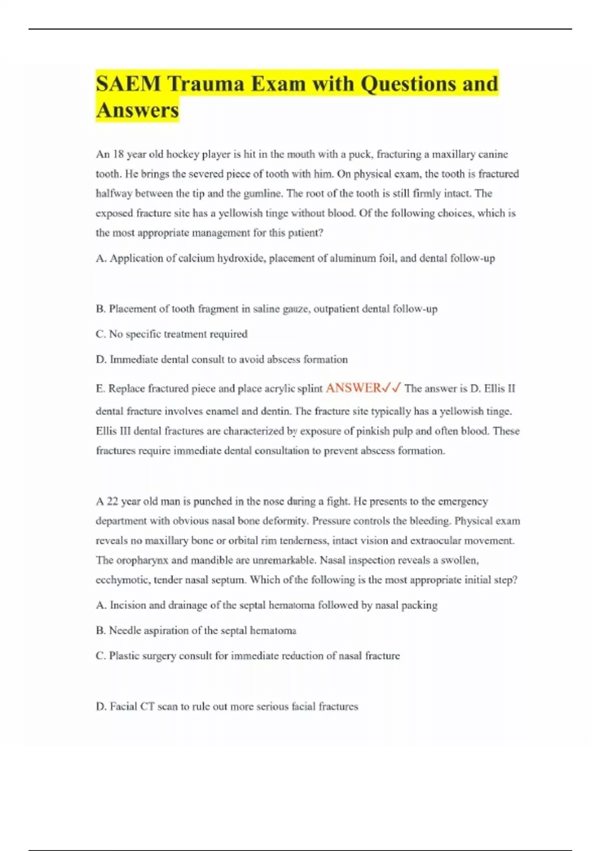SAEM Trauma Exam with Questions and Answers An 18 year old hockey player is hit in the mouth with a puck, fracturing a maxillary canine tooth. He brings the severed piece of tooth with him. On physical exam, the tooth is fractured halfway between the tip and the gumline. The root of the tooth is still firmly intact. The exposed fracture site has a yellowish tinge without blood. Of the following choices, which is the most appropriate management for this patient? A. Application of calcium hydroxide, placement of aluminum foil, and dental follow-up B. Placement of tooth fragment in saline gauze, outpatient dental follow-up C. No specific treatment required D. Immediate dental consult to avoid abscess formation E. Replace fractured piece and place acrylic splint ANSWER The answer is D. Ellis II dental fracture involves enamel and dentin. The fracture site typically has a yellowish tinge. Ellis III dental fractures are characterized by exposure of pinkish pulp and often blood. These fractures require immediate dental consultation to prevent abscess formation. A 22 year old man is punched in the nose during a fight. He presents to the emergency department with obvious nasal bone deformity. Pressure controls the bleeding. Physical exam reveals no maxillary bone or orbital rim tenderness, intact vision and extraocular movement. The oropharynx and mandible are unremarkable. Nasal inspection reveals a swollen, ecchymotic, tender nasal septum. Which of the following is the most appropriate initial step? A. Incision and drainage of the septal hematoma followed by nasal packing B. Needle aspiration of the septal hematoma C. Plastic surgery consult for immediate reduction of nasal fracture D. Facial CT scan to rule out more serious facial fractures
