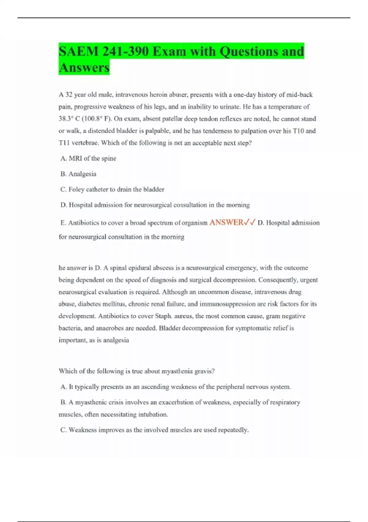 SAEM 241-390 Exam with Questions and Answers A 32 year old male, intravenous heroin abuser, presents with a one-day history of mid-back pain, progressive weakness of his legs, and an inability to urinate. He has a temperature of 38.3° C (100.8° F). On exam, absent patellar deep tendon reflexes are noted, he cannot stand or walk, a distended bladder is palpable, and he has tenderness to palpation over his T10 and T11 vertebrae. Which of the following is not an acceptable next step? A. MRI of the spine B. Analgesia C. Foley catheter to drain the bladder D. Hospital admission for neurosurgical consultation in the morning E. Antibiotics to cover a broad spectrum of organism ANSWER D. Hospital admission for neurosurgical consultation in the morning he answer is D. A spinal epidural abscess is a neurosurgical emergency, with the outcome being dependent on the speed of diagnosis and surgical decompression. Consequently, urgent neurosurgical evaluation is required. Although an uncommon disease, intravenous drug abuse, diabetes mellitus, chronic renal failure, and immunosuppression are risk factors for its development. Antibiotics to cover Staph. aureus, the most common cause, gram negative bacteria, and anaerobes are needed. Bladder decompression for symptomatic relief is important, as is analgesia Which of the following is true about myasthenia gravis? A. It typically presents as an ascending weakness of the peripheral nervous system. B. A myasthenic crisis involves an exacerbation of weakness, especially of respiratory muscles, often necessitating intubation. C. Weakness improves as the involved muscles are used repeatedly.