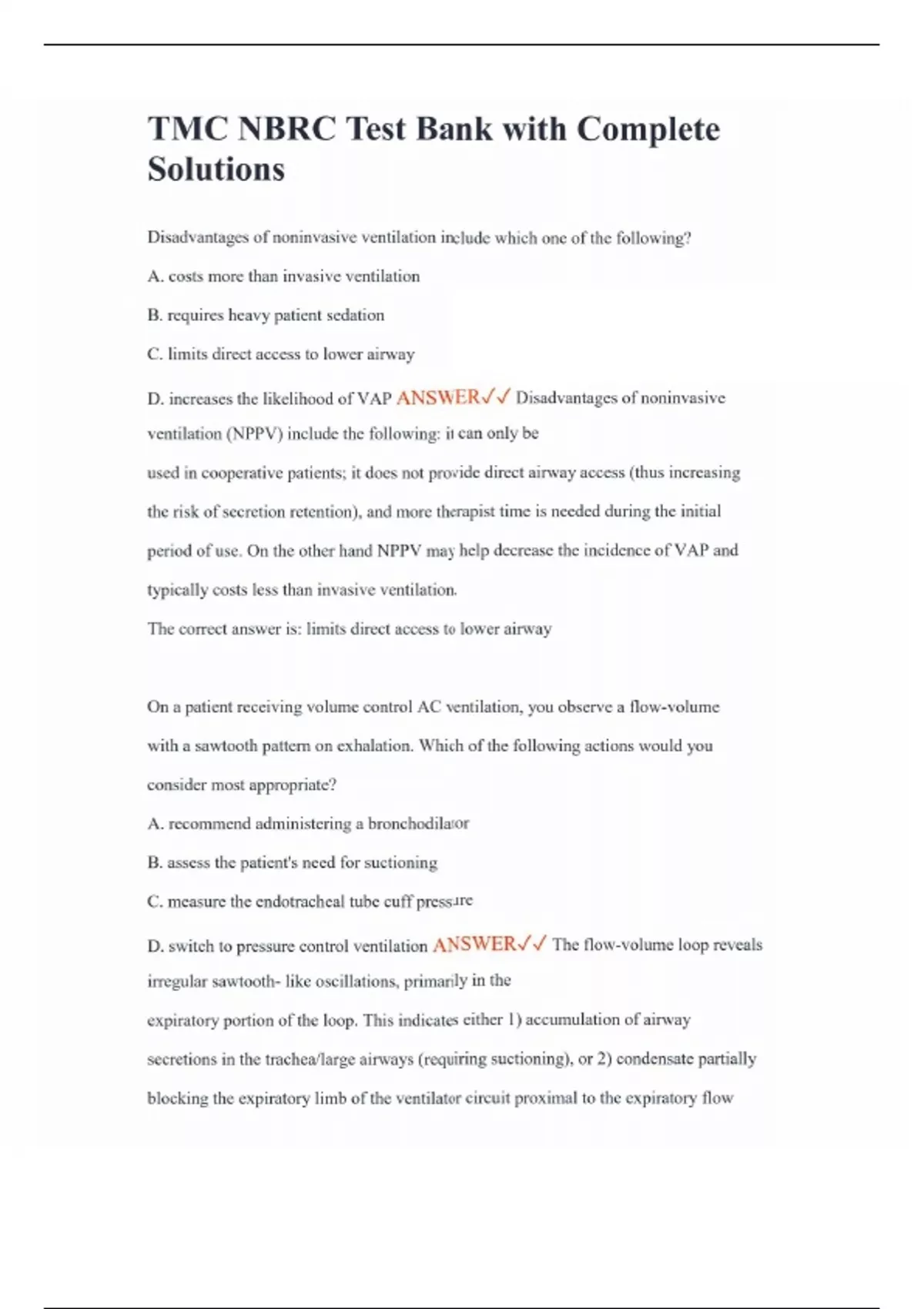 TMC NBRC Test Bank with Complete Solutions Disadvantages of noninvasive ventilation include which one of the following? A. costs more than invasive ventilation B. requires heavy patient sedation C. limits direct access to lower airway D. increases the likelihood of VAP ANSWER Disadvantages of noninvasive ventilation (NPPV) include the following: it can only be used in cooperative patients; it does not provide direct airway access (thus increasing the risk of secretion retention), and more therapist time is needed during the initial period of use. On the other hand NPPV may help decrease the incidence of VAP and typically costs less than invasive ventilation. The correct answer is: limits direct access to lower airway On a patient receiving volume control AC ventilation, you observe a flow-volume with a sawtooth pattern on exhalation. Which of the following actions would you consider most appropriate? A. recommend administering a bronchodilator B. assess the patient's need for suctioning C. measure the endotracheal tube cuff pressure D. switch to pressure control ventilation ANSWER The flow-volume loop reveals irregular sawtooth- like oscillations, primarily in the expiratory portion of the loop. This indicates either 1) accumulation of airway secretions in the trachea/large airways (requiring suctioning), or 2) condensate partially blocking the expiratory limb of the ventilator circuit proximal to the expiratory flow