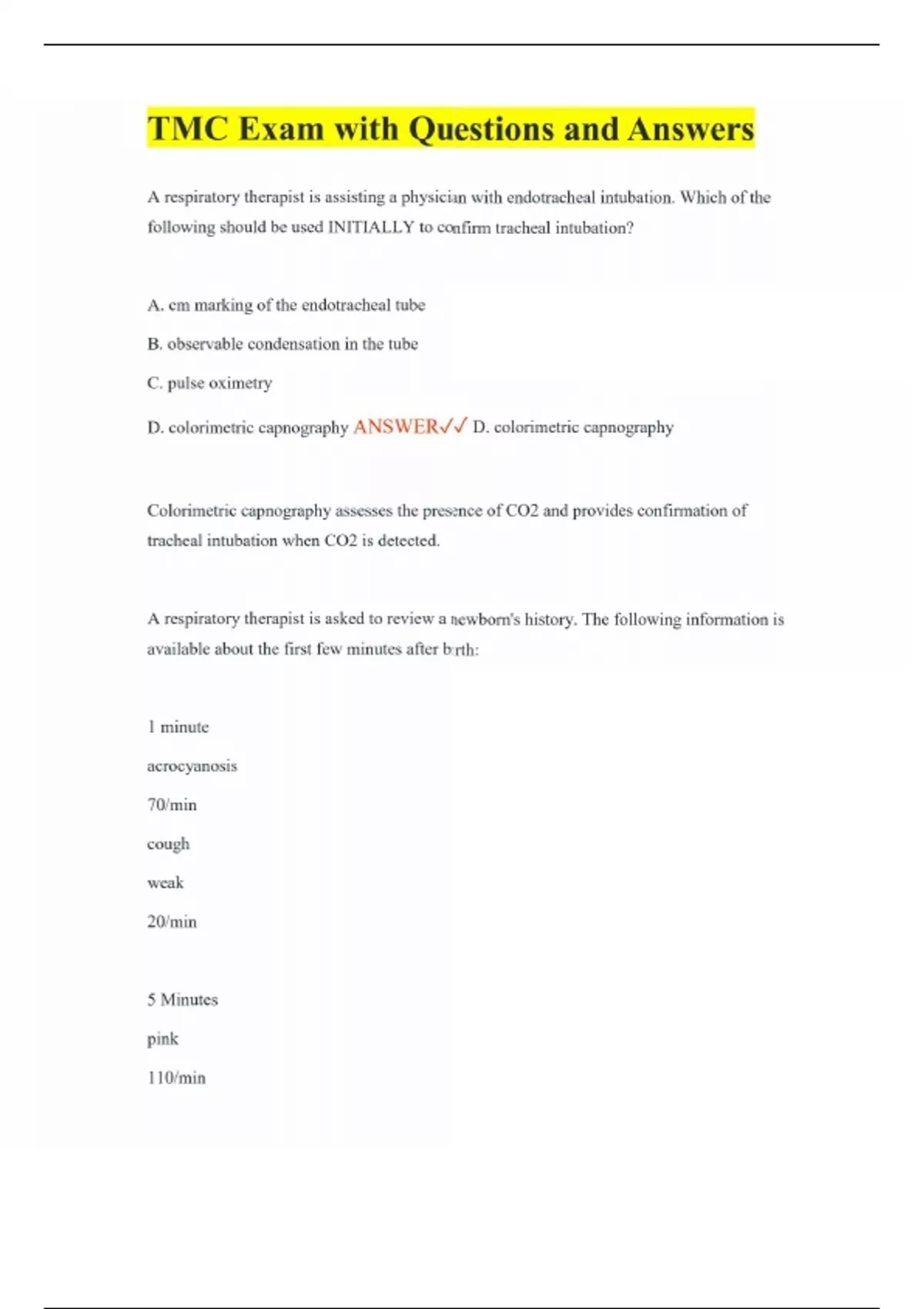 TMC Exam with Questions and Answers A respiratory therapist is assisting a physician with endotracheal intubation. Which of the following should be used INITIALLY to confirm tracheal intubation? A. cm marking of the endotracheal tube B. observable condensation in the tube C. pulse oximetry D. colorimetric capnography ANSWER D. colorimetric capnography Colorimetric capnography assesses the presence of CO2 and provides confirmation of tracheal intubation when CO2 is detected. A respiratory therapist is asked to review a newborn's history. The following information is available about the first few minutes after birth: 1 minute acrocyanosis 70/min cough weak 20/min ANSWER 5 Minutes pink 110/min
