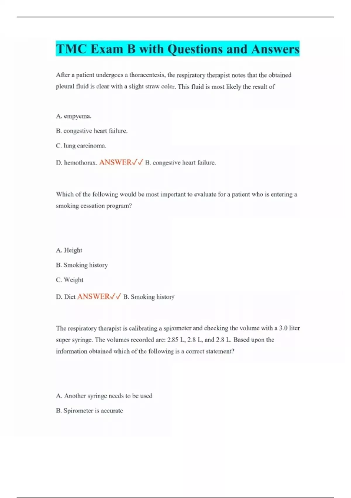 TMC Exam B with Questions and Answers After a patient undergoes a thoracentesis, the respiratory therapist notes that the obtained pleural fluid is clear with a slight straw color. This fluid is most likely the result of A. empyema. B. congestive heart failure. C. lung carcinoma. D. hemothorax. ANSWER B. congestive heart failure. Which of the following would be most important to evaluate for a patient who is entering a smoking cessation program? A. Height B. Smoking history C. Weight D. Diet ANSWER B. Smoking history The respiratory therapist is calibrating a spirometer and checking the volume with a 3.0 liter super syringe. The volumes recorded are: 2.85 L, 2.8 L, and 2.8 L. Based upon the information obtained which of the following is a correct statement? A. Another syringe needs to be used B. Spirometer is accurate