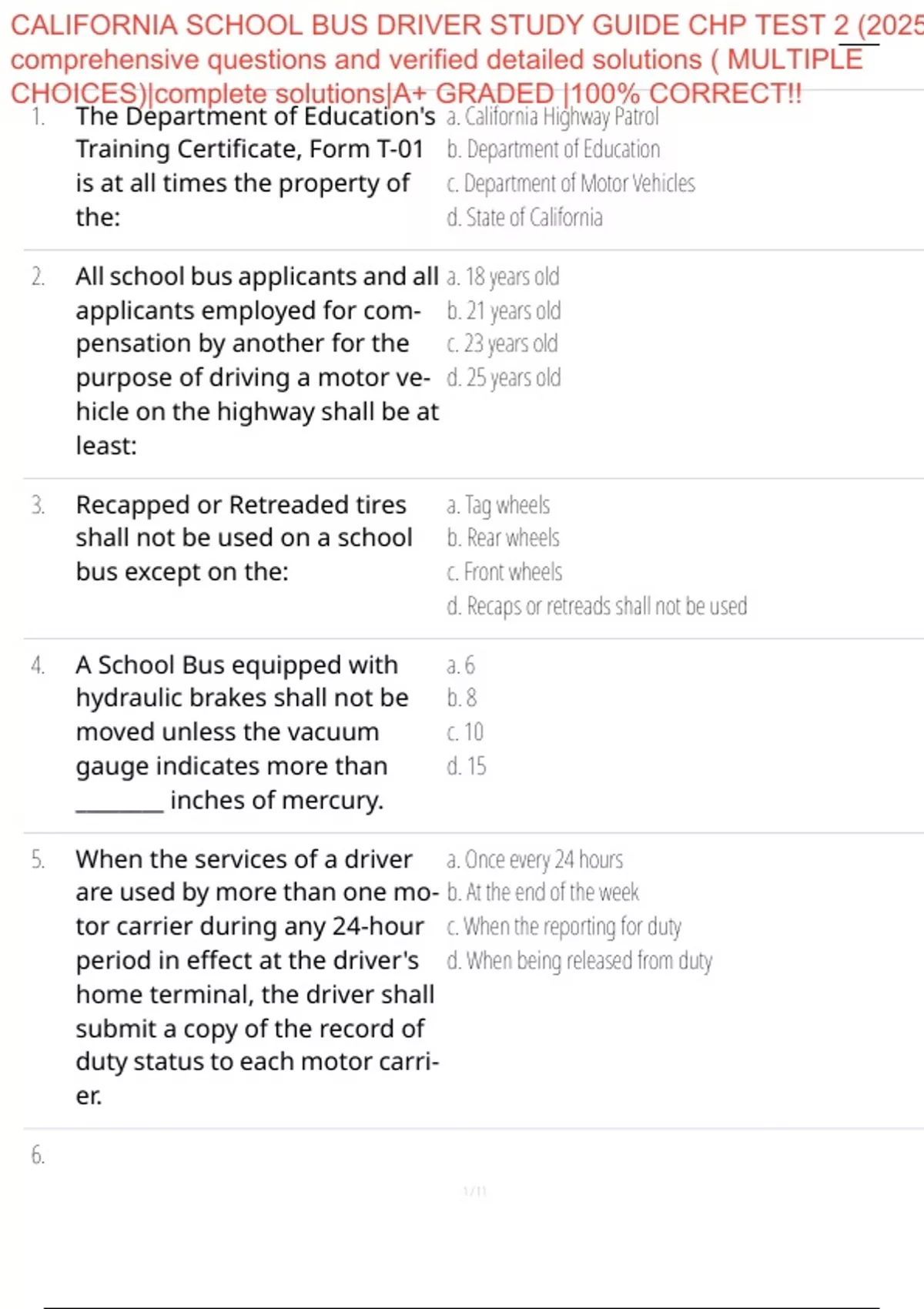 CALIFORNIA SCHOOL BUS DRIVER STUDY GUIDE CHP TEST 2 (2025) comprehensive questions and verified detailed solutions ( MULTIPLE CHOICES)|complete solutions|A+ GRADED |100% CORRECT!!