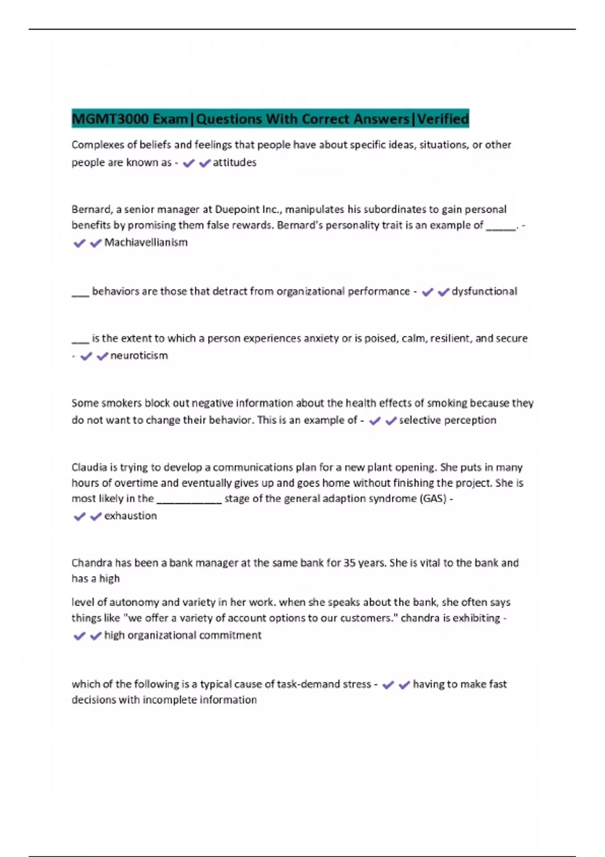 MGMT 3000 EXAMS BUNDLE | Questions With Correct Answers |Verified| Already Graded