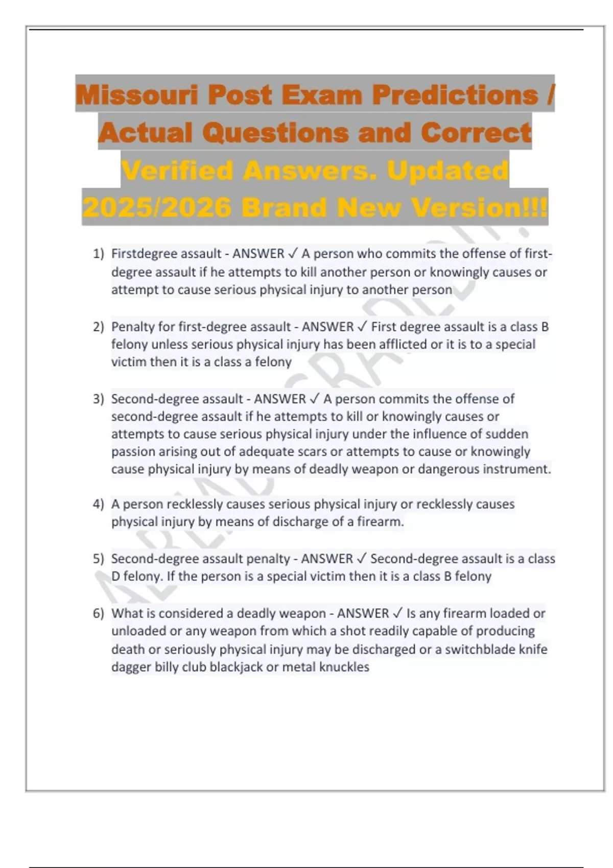 Missouri Post Exam Predictions / Actual Questions and Correct Verified Answers. Updated 2025/2026 Brand New Version!!! 1) First degree assault - ANSWER A person who commits the offense of first degree assault if he attempts to kill another person or knowingly causes or attempt to cause serious physical injury to another person 2) Penalty for first-degree assault - ANSWER First degree assault is a class B felony unless serious physical injury has been afflicted or it is to a special victim then it is a class a felony 3) Second-degree assault - ANSWER A person commits the offense of second-degree assault if he attempts to kill or knowingly causes or attempts to cause serious physical injury under the influence of sudden passion arising out of adequate scars or attempts to cause or knowingly cause physical injury by means of deadly weapon or dangerous instrument. 4) A person recklessly causes serious physical injury or recklessly causes physical injury by means of discharge of a firearm. 5) Second-degree assault penalty - ANSWER Second-degree assault is a class D felony. If the person is a special victim then it is a class B felony 6) What is considered a deadly weapon - ANSWER Is any firearm loaded or unloaded or any weapon from which a shot readily capable of producing death or seriously physical injury may be discharged or a switchblade knife dagger billy club blackjack or metal knuckles 7) What is considered a dangerous instrument - ANSWER Any instrument article or substance capable of causing death or serious physical injury in the circumstances in which it is used 8) Third-degree assault - ANSWER A person who commits the offense of third- degree assault if he knowingly causes physical injury to another person 9) Third-degree assault penalty - ANSWER Third- degree assault is a class C felony. If a person is a special victim then it is a class D felony 10) Fourth-degree assault - ANSWER A person who commits the offense of 4thdegree assault if he attempts to cause or recklessly cause physical injury physical pain or illness. If he with criminal negligence causes physical injury by means of a firearm or purposely places another person and hypertension of immediate physical injury or recklessly engages in conduct which creates a substance Stansel risk of death or serious physical injury. If he knowingly causes physical contact with a disabled person with a reasonable person who is not disabled would consider offensive or provocative or no only causes physical contact with another person knowing the other person will regard the contact as offensive or provocative 11) Fourth-degree assault penalties - ANSWER Fourth degree assault is a class a misdemeanor if a person violates subdivision 1 to4 or five above. It is a class C misdemeanor if a person violates subdivisions three or six unless the victim is a special victim then it is a class a misdemeanor 12) Make sure to review pages 6970 and 71 for additional information in regards to Assault - ANSWER Make sure to review pages 6970 and 71 for additional information in regards to assault 13) Class F intermediate license - ANSWER Available age is 16 years old - this is the second step in the drivers program. This license allows young drivers. 14) What is probation? - ANSWER Probation is a period of time imposed by the judge during which the defendant must comply with certain conditions 15) What is parole? - ANSWER Parole the defendant has been incarcerated for a portion of the sentence imposed by the judge. Prior to the completion of the sentence the defendant can be released on parole. The parole. Runs until the term he was sentenced to run out 16) What is the 24 hour rule - ANSWER All persons arrested without a warrant and can find at any jail or other place of confinement must be charged by the prosecutor within 24 hours of their arrest. If the Resty is not charged with a criminal offense within 24 hours of their arrest the jail shall release them from custody 17) Kidnapping in the first degree - ANSWER A definite commits the offense of kidnapping in the first- degree if he unlawfully removed another from where he is found or unlawful he can find another for a substantial period of time for the purpose of holding for ransom reward or for any act be performed or not performed for the release or using a person as a shield or as a hostage or interfering with the performance of any governmental or political function or facilitating the commission of any felony or flight there after or inflicting physical injury on or terrorizing the victim 18) Kidnapping in the second degree - ANSWER A definite committed the offense of kidnapping in a second-degree if he knowingly restrains another person unlawfully in without consent or so as to interfere with his liberty and exposes him or her to substantial risk of serious physical injury 19) Kidnapping in the third degree - ANSWER A definite committed the offense of kidnapping a third-degree if he knowingly restrained another person unlawfully and without consent so as to interfere with his or her liberty 20) Kidnapping example number one - ANSWER Donald carries off a small child who is playing in her front yard intending to drive the child to his hideout and hold her for ransom but the police apprehend him before he reaches his hideout with the victim Donald is guilty of kidnapping in the first- degree because he remove the victim without consent for the purpose of holding the child for ransom 21) Kidnapping example two - ANSWER Donald is a fugitive from the police having robbed a bank several weeks ago. As the police are closing in on him he runs inside of residence and holds the family inside at gunpoint for several hours. At one point he yells to the police I'll let the kids go if you give me a car and a 10 minute Headstart. Donald guilty of kidnapping in the first degree because he can find his victims for essential period of time for purposes of receiving something in return for the release