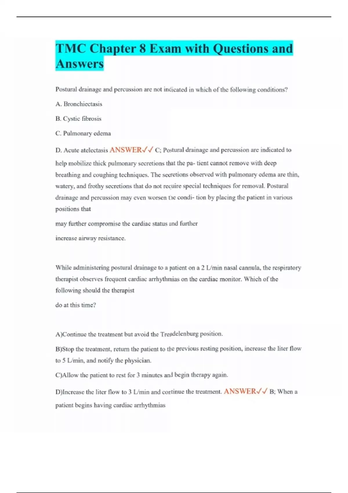 TMC Chapter 8 Exam with Questions and Answers Postural drainage and percussion are not indicated in which of the following conditions? A. Bronchiectasis B. Cystic fibrosis C. Pulmonary edema D. Acute atelectasis ANSWER C; Postural drainage and percussion are indicated to help mobilize thick pulmonary secretions that the pa- tient cannot remove with deep breathing and coughing techniques. The secretions observed with pulmonary edema are thin, watery, and frothy secretions that do not require special techniques for removal. Postural drainage and percussion may even worsen the condi- tion by placing the patient in various positions that may further compromise the cardiac status and further increase airway resistance. While administering postural drainage to a patient on a 2 L/min nasal cannula, the respiratory therapist observes frequent cardiac arrhythmias on the cardiac monitor. Which of the following should the therapist do at this time? A)Continue the treatment but avoid the Trendelenburg position. B)Stop the treatment, return the patient to the previous resting position, increase the liter flow to 5 L/min, and notify the physician. C)Allow the patient to rest for 3 minutes and begin therapy again. D)Increase the liter flow to 3 L/min and continue the treatment. ANSWER B; When a patient begins having cardiac arrhythmias