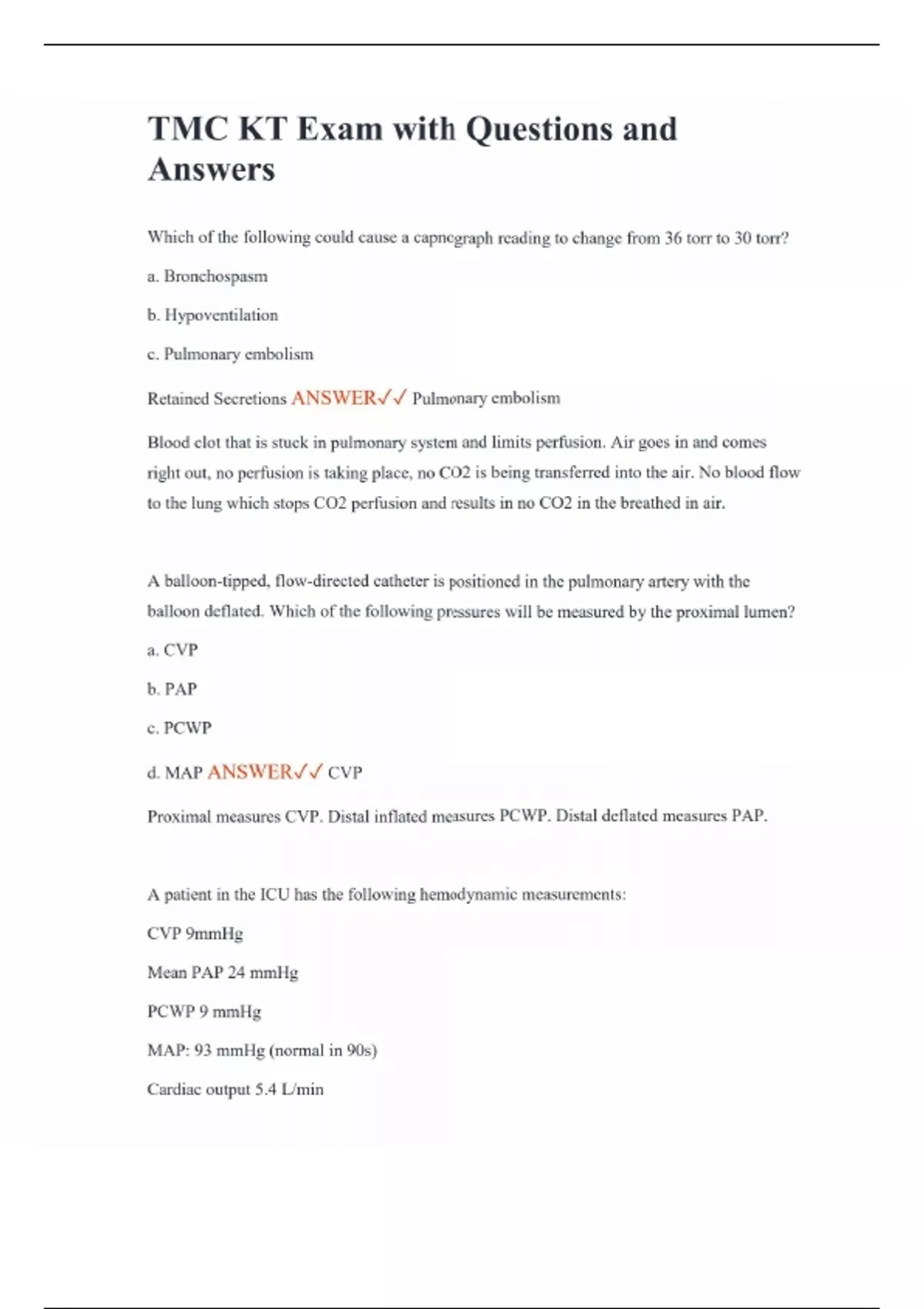 TMC KT Exam with Questions and Answers Which of the following could cause a capnograph reading to change from 36 torr to 30 torr? a. Bronchospasm b. Hypoventilation c. Pulmonary embolism Retained Secretions ANSWER Pulmonary embolism Blood clot that is stuck in pulmonary system and limits perfusion. Air goes in and comes right out, no perfusion is taking place, no CO2 is being transferred into the air. No blood flow to the lung which stops CO2 perfusion and results in no CO2 in the breathed in air. A balloon-tipped, flow-directed catheter is positioned in the pulmonary artery with the balloon deflated. Which of the following pressures will be measured by the proximal lumen? a. CVP b. PAP c. PCWP d. MAP ANSWER CVP Proximal measures CVP. Distal inflated measures PCWP. Distal deflated measures PAP. A patient in the ICU has the following hemodynamic measurements: CVP 9mmHg Mean PAP 24 mmHg PCWP 9 mmHg MAP: 93 mmHg (normal in 90s) Cardiac output 5.4 L/min