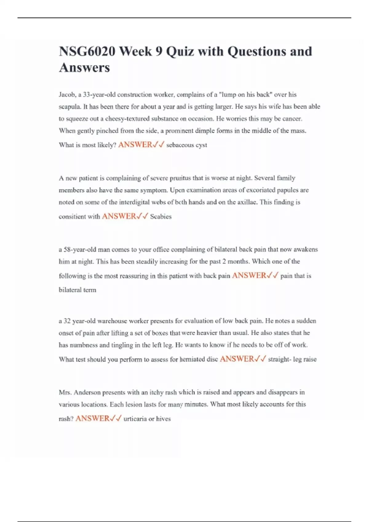 NSG6020 Week 9 Quiz with Questions and Answers Jacob, a 33-year-old construction worker, complains of a "lump on his back" over his scapula. It has been there for about a year and is getting larger. He says his wife has been able to squeeze out a cheesy-textured substance on occasion. He worries this may be cancer. When gently pinched from the side, a prominent dimple forms in the middle of the mass. What is most likely? ANSWER sebaceous cyst A new patient is complaining of severe pruritus that is worse at night. Several family members also have the same symptom. Upon examination areas of excoriated papules are noted on some of the interdigital webs of both hands and on the axillae. This finding is consitient with ANSWER Scabies a 58-year-old man comes to your office complaining of bilateral back pain that now awakens him at night. This has been steadily increasing for the past 2 months. Which one of the following is the most reassuring in this patient with back pain ANSWER pain that is bilateral term a 32 year-old warehouse worker presents for evaluation of low back pain. He notes a sudden onset of pain after lifting a set of boxes that were heavier than usual. He also states that he has numbness and tingling in the left leg. He wants to know if he needs to be off of work. What test should you perform to assess for herniated disc ANSWER straight- leg raise Mrs. Anderson presents with an itchy rash which is raised and appears and disappears in various locations. Each lesion lasts for many minutes. What most likely accounts for this rash? ANSWER urticaria or hives