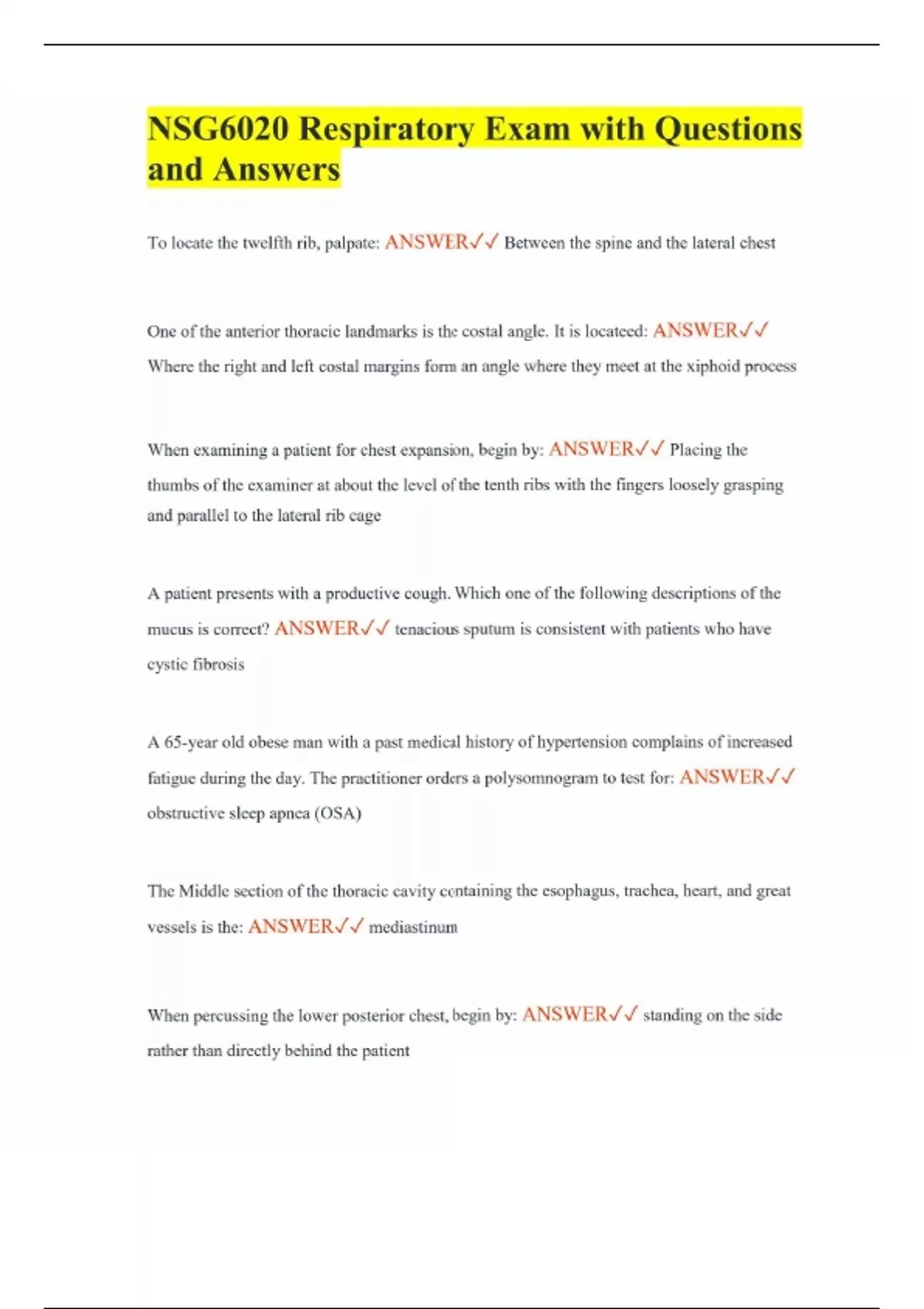 NSG6020 Respiratory Exam with Questions and Answers To locate the twelfth rib, palpate: ANSWER Between the spine and the lateral chest One of the anterior thoracic landmarks is the costal angle. It is locateed: ANSWER Where the right and left costal margins form an angle where they meet at the xiphoid process When examining a patient for chest expansion, begin by: ANSWER Placing the thumbs of the examiner at about the level of the tenth ribs with the fingers loosely grasping and parallel to the lateral rib cage A patient presents with a productive cough. Which one of the following descriptions of the mucus is correct? ANSWER tenacious sputum is consistent with patients who have cystic fibrosis A 65-year old obese man with a past medical history of hypertension complains of increased fatigue during the day. The practitioner orders a polysomnogram to test for: ANSWER obstructive sleep apnea (OSA) The Middle section of the thoracic cavity containing the esophagus, trachea, heart, and great vessels is the: ANSWER mediastinum When percussing the lower posterior chest, begin by: ANSWER standing on the side rather than directly behind the patient
