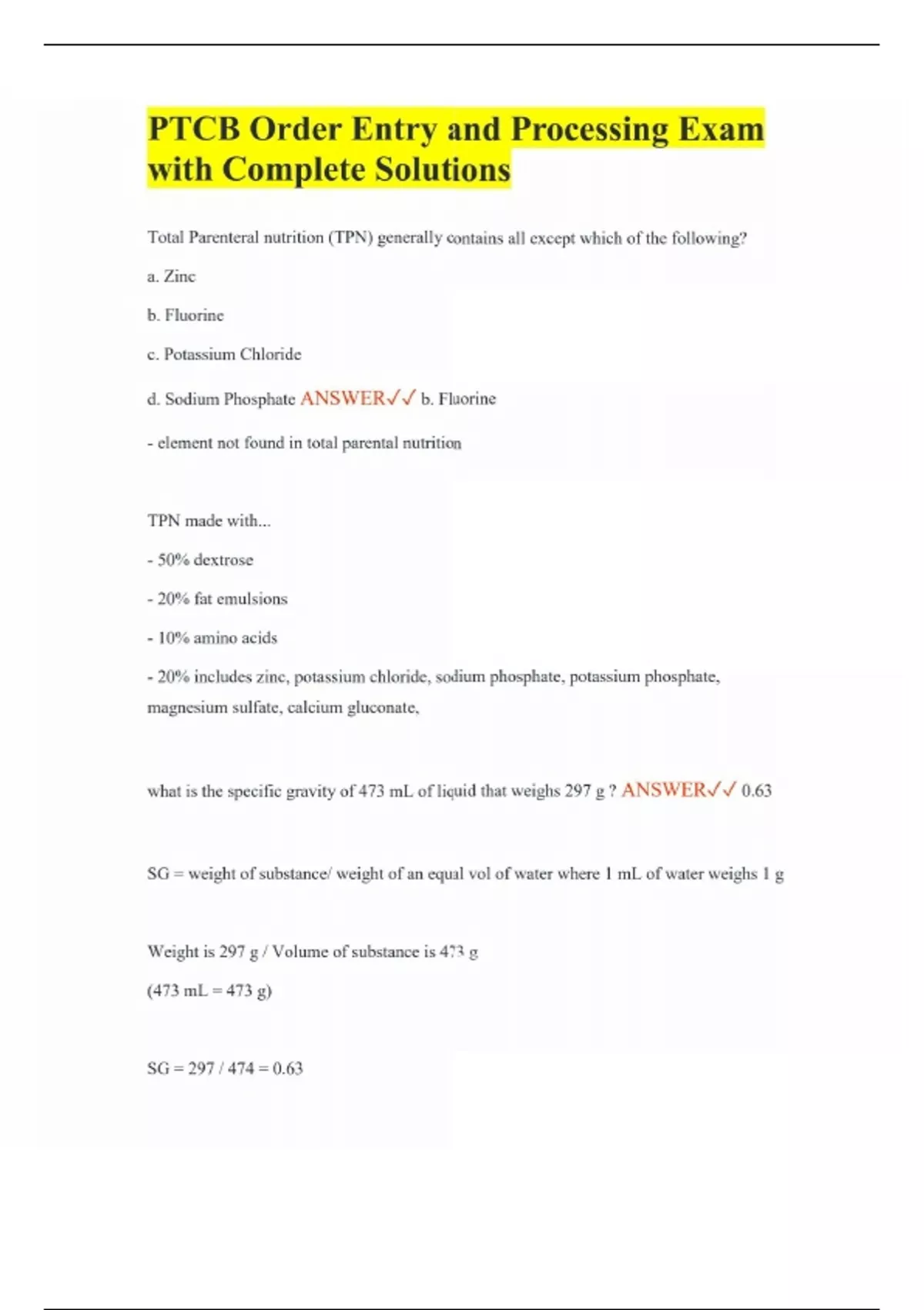 PTCB Order Entry and Processing Exam with Complete Solutions Total Parenteral nutrition (TPN) generally contains all except which of the following? a. Zinc b. Fluorine c. Potassium Chloride d. Sodium Phosphate ANSWER b. Fluorine - element not found in total parental nutrition TPN made with... - 50% dextrose - 20% fat emulsions - 10% amino acids - 20% includes zinc, potassium chloride, sodium phosphate, potassium phosphate, magnesium sulfate, calcium gluconate, what is the specific gravity of 473 mL of liquid that weighs 297 g ? ANSWER 0.63 SG = weight of substance/ weight of an equal vol of water where 1 mL of water weighs 1 g Weight is 297 g / Volume of substance is 473 g (473 mL = 473 g) SG = 297 / 474 = 0.63