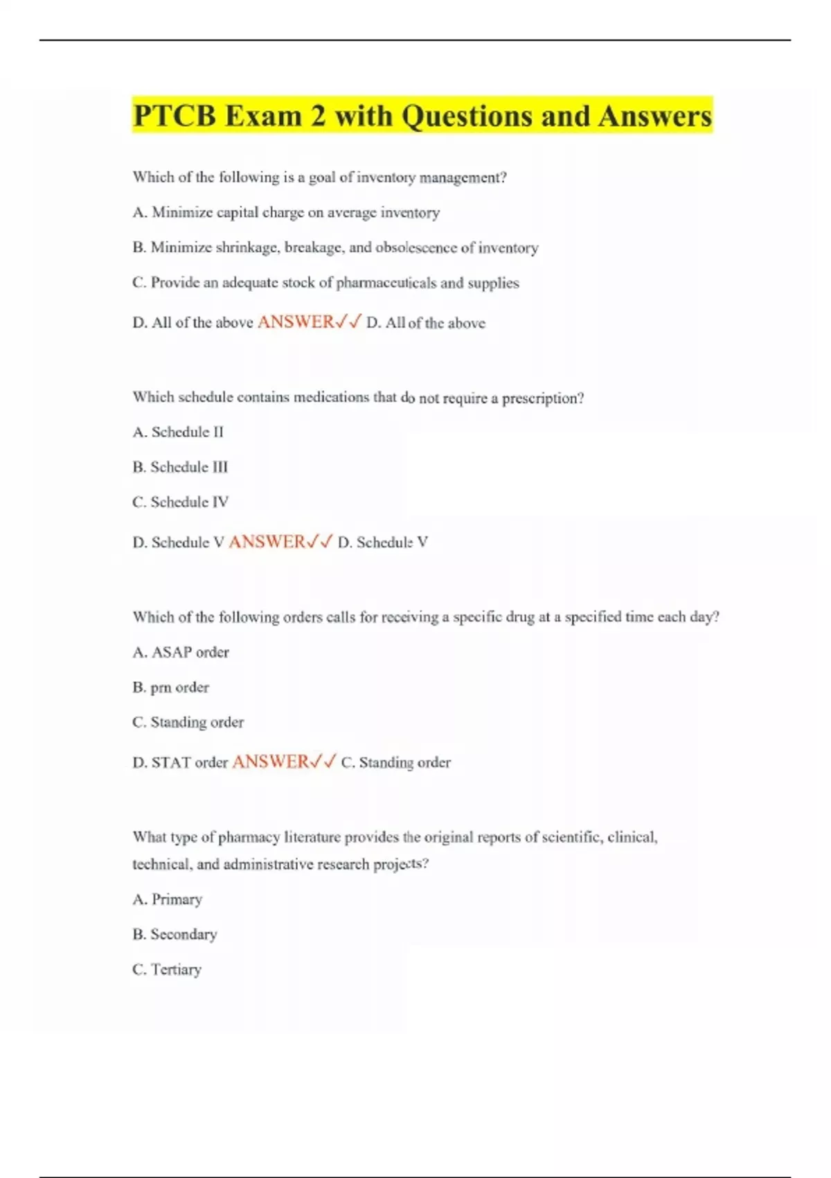 PTCB Exam 2 with Questions and Answers Which of the following is a goal of inventory management? A. Minimize capital charge on average inventory B. Minimize shrinkage, breakage, and obsolescence of inventory C. Provide an adequate stock of pharmaceuticals and supplies D. All of the above ANSWER D. All of the above Which schedule contains medications that do not require a prescription? A. Schedule II B. Schedule III C. Schedule IV D. Schedule V ANSWER D. Schedule V Which of the following orders calls for receiving a specific drug at a specified time each day? A. ASAP order B. prn order C. Standing order D. STAT order ANSWER C. Standing order What type of pharmacy literature provides the original reports of scientific, clinical, technical, and administrative research projects? A. Primary B. Secondary C. Tertiary