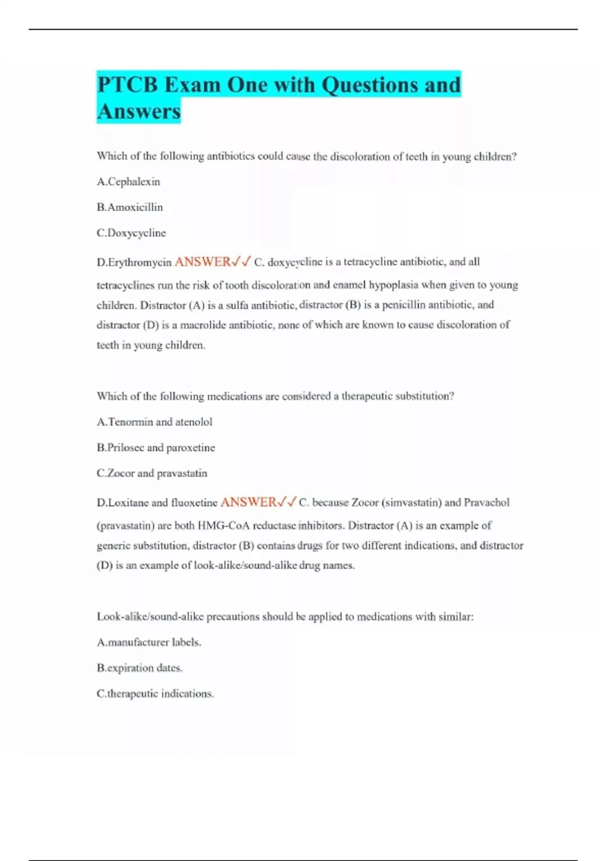 PTCB Exam One with Questions and Answers Which of the following antibiotics could cause the discoloration of teeth in young children? A.Cephalexin B.Amoxicillin C.Doxycycline D.Erythromycin ANSWER C. doxycycline is a tetracycline antibiotic, and all tetracyclines run the risk of tooth discoloration and enamel hypoplasia when given to young children. Distractor (A) is a sulfa antibiotic, distractor (B) is a penicillin antibiotic, and distractor (D) is a macrolide antibiotic, none of which are known to cause discoloration of teeth in young children. Which of the following medications are considered a therapeutic substitution? A.Tenormin and atenolol B.Prilosec and paroxetine C.Zocor and pravastatin D.Loxitane and fluoxetine ANSWER C. because Zocor (simvastatin) and Pravachol (pravastatin) are both HMG-CoA reductase inhibitors. Distractor (A) is an example of generic substitution, distractor (B) contains drugs for two different indications, and distractor (D) is an example of look-alike/sound-alike drug names. Look-alike/sound-alike precautions should be applied to medications with similar: A.manufacturer labels. B.expiration dates. C.therapeutic indications.