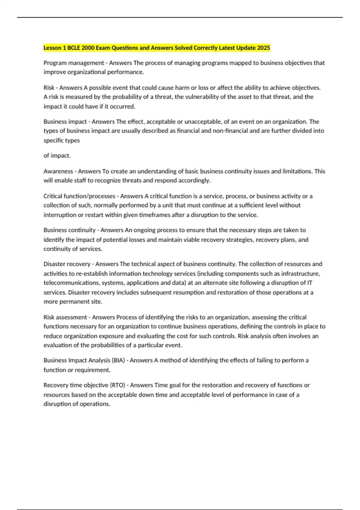 Business Impact Analysis (BIA) - Answers A method of identifying the effects of failing to perform a
