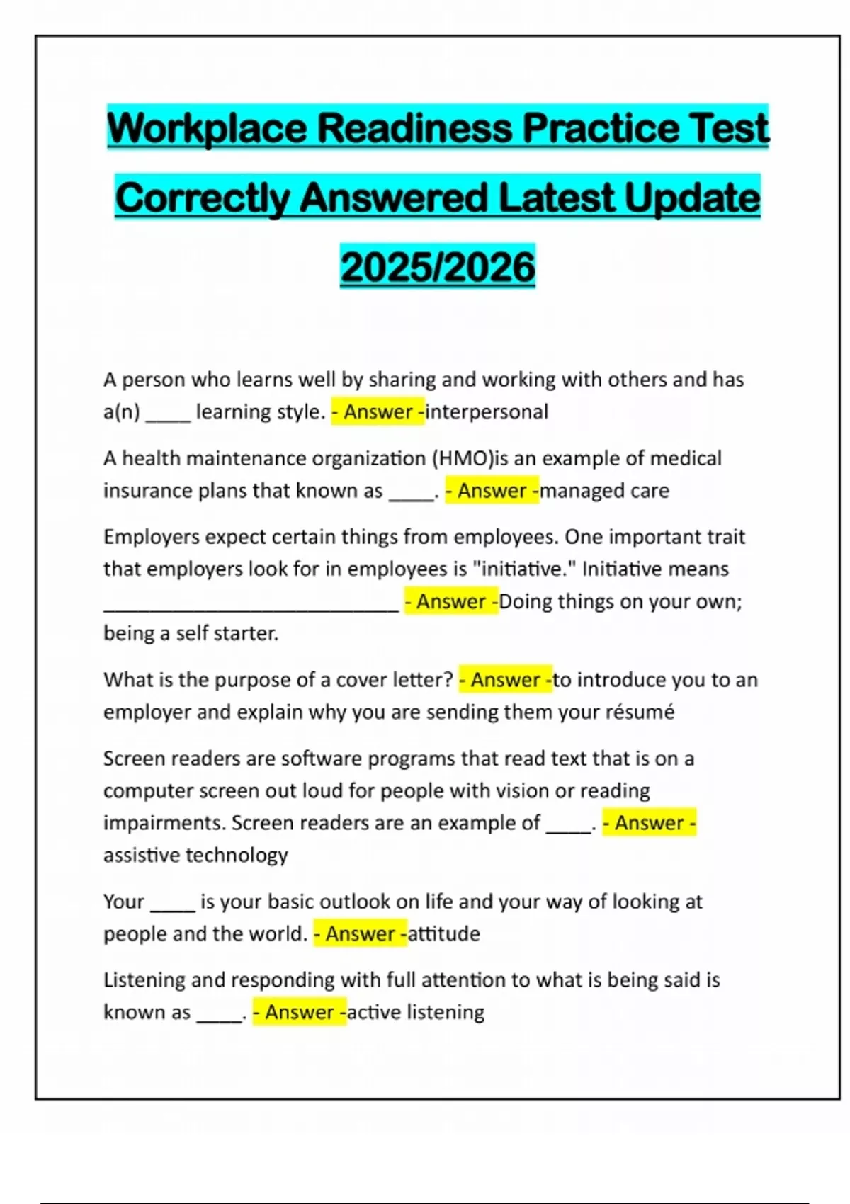 Workplace Readiness Practice Test Correctly Answered Latest Update 2025/2026 A person who learns well by sharing and working with others and has a(n) ____ learning style. - Answer -interpersonal A health maintenance organization (HMO)is an example of medical insurance plans that known as ____. - Answer -managed care Employers expect certain things from employees. One important trait that employers look for in employees is "initiative." Initiative means __________________________ - Answer -Doing things on your own; being a self starter. What is the purpose of a cover letter? - Answer -to introduce you to an employer and explain why you are sending them your résumé Screen readers are software programs that read text that is on a computer screen out loud for people with vision or reading impairments. Screen readers are an example of ____. - Answer - assistive technology Your ____ is your basic outlook on life and your way of looking at people and the world. - Answer -attitude Listening and responding with full attention to what is being said is known as ____. - Answer -active listening____ skills include listening, problem solving, and maintaining a calm and positive attitude in challenging situations. - Answer -Customer Relations A goal that you can accomplish quickly is known as a ____. - Answer - short-term goal The ability to say and do things in a respectful way is called ____. - Answer -tact Being ____ means being direct, honest, and polite. - Answer -assertive If there is a fire in the workplace, you should ____. - Answer -learning the location of emergency exits, learn first aid, participate in safety training, such as fire drills A Social Security number ____. - Answer -Is a unique nine-digit number issued by the federal government Is required for all U.S. workers
